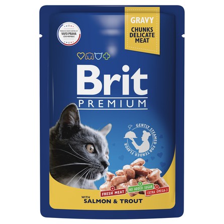 Нежные кусочки лосося и форели в ароматном соусе — идеальное сочетание для полноценного и сбалансированного рациона. Паучи Brit Premium однозначно заинтересуют вашу кошку и станут для нее любимым блюдом. Влажный корм содержит все необходимые витамины и минералы, которые необходимы питомцу. Таурин в составе — важный ингредиент для поддержания остроты зрения и здоровья сердечно-сосудистой системы кошек.