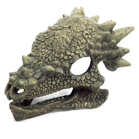 Небольшой реалистичный грот, стилизованный под череп ископаемого динозавра - элемент для оригинального оформления любых пресноводных аквариумов, а так же для террариумов. Этот грот послужит дополнительным укрытием для маленьких рыб, отвечая тем самым не только за эстетику, но и принося обитателям аквариума реальную пользу. Такой грот может быть использован как самостоятельный элемент декора - для оформления небольшого аквариума, так и в комплекте с другими гротами, объемными фонами и искусственными растениями - для оформления аквариума большого объема. Изготовлен из нетоксичной полиэфирной смолы, очень прочный и долговечный, удобный в эксплуатации и совершенно безвредный для аквариумных жителей.