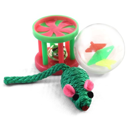 Этот набор из трех ярких игрушек - отличный вариант для активной и разнообразной игры с пушистыми питомцами. В комплект входят: барабан-погремушка (d40х40мм), мячик (d45мм) и мышка из полиэстера (50х24х24мм). С такими игрушками маленькие котята хорошо развиваются, а взрослые животные - держат себя в тонусе и оттачивают охотничьи навыки. Набор упакован в прозрачный пакет c клапаном.