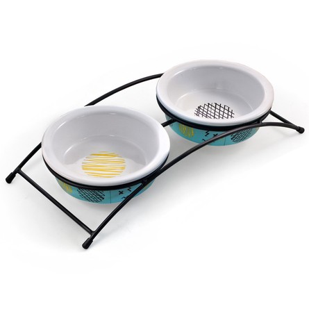 Этот функциональный комплект из двух универсальных круглых мисок на подставке выполнен из керамики высокого качества и отлично подходит для кошек и собак мелких пород. Такие миски идеальны как для воды, так и для корма разной консистенции. Изделие комфортно для питомца и легко моется под струей проточной воды с использованием моющих бытовых средств. А эффектный дизайн стилизованной под ковку подставки позволит ей стать украшением любого интерьера. Цвет: бирюзовый. Размер: d дна - 73мм; d в верхней части - 100мм; высота - 35мм. Размер подставки - 250*110*45мм. Объем 2*0,12л.
