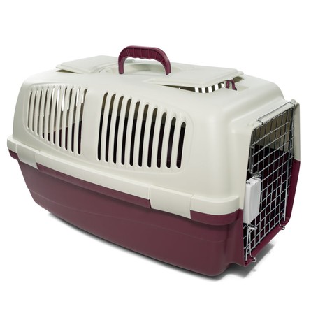 Переноска выполнена из прочного пластика. Оснащена вентиляционными окошками, металлической дверцей, надежным замком и удобной ручкой для транспортировки. Максимальная нагрузка: 3кг. Цвет: верх - молочный, низ - бургунди. Размер: 480*290*280мм.