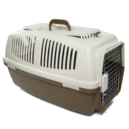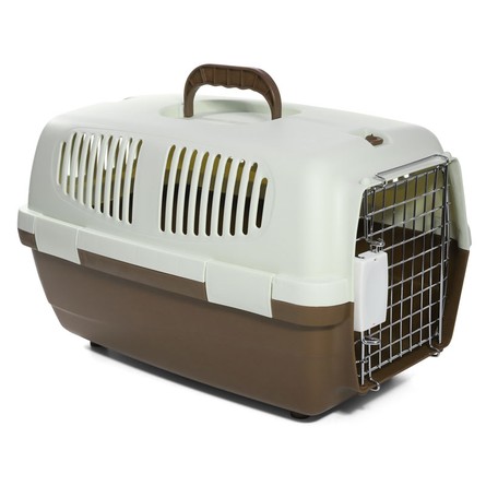 Переноска выполнена из прочного пластика. Оснащена вентиляционными окошками, металлической дверцей, надежным замком и удобной ручкой для транспортировки. На крышке расположены два люка, которые могут использоваться а качестве карманов для сопутствующих предметов или как дополнительная вентиляция. Максимальная нагрузка: 9кг. Цвет: верх - молочный, низ - капучино. Размер: 620*390*380мм.