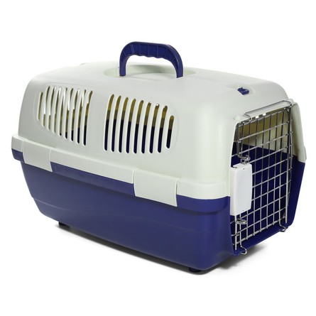 Переноска выполнена из прочного пластика. Оснащена вентиляционными окошками, металлической дверцей, надежным замком и удобной ручкой для транспортировки. На крышке расположены два люка, которые могут использоваться а качестве карманов для сопутствующих предметов или как дополнительная вентиляция. Максимальная нагрузка: 9кг. Цвет: верх - молочный, низ - индиго. Размер: 620*390*380мм.