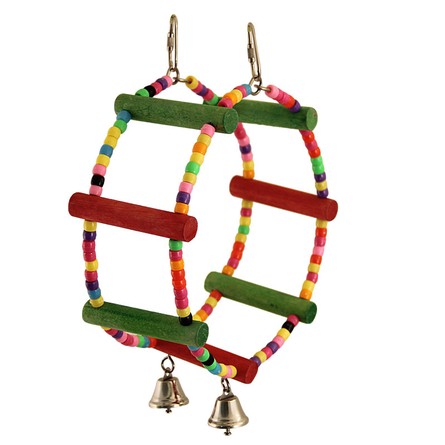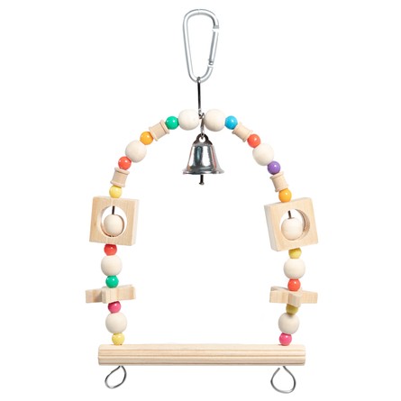 Игрушка для птиц в виде качелей из деревянных и пластиковых бус и колокольчика. Крепление: карабин. Цвет: натуральное дерево. Размер: 160/210*120мм.