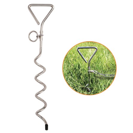 Фиксатор выполнен в виде штопора, который легко вкручивается в землю, обеспечивая надежное закрепление тросового поводка или цепи на территории. Держатель выполнен из высокопрочной стали и оснащен кольцом для крепления цепи. Размеры изделия: 415*90 мм.