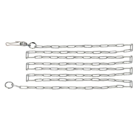 Эта стальная привязочная цепь для собак способна выдерживать рывки до 200 кг. Прочная и долговечная, она имеет надежное крепление и карабин, который обеспечит быстрое закрепление цепи на той территории, где необходимо обеспечить охрану. Расположенное с другого конца изделия кольцо можно закрепить на вбитом в землю штопор-держателе или импровизированном столбе. Диаметр проволоки - 6мм, длина - 2800мм.