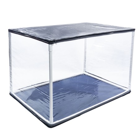 Прозрачная палатка-аквариум – универсальный вариант для презентации питомца на профильной выставке. Прозрачный корпус дает удобный круговой обзор. Разборная конструкция легко собирается и разбирается. Вентиляционная сетка обеспечивает животному свободный приток воздуха, а боковые столбы служат надежной опорой. Изделие открывается спереди – при помощи удобной молнии. Палатка компактно складывается в чехол, не занимая много места в помещении. Цвет: прозрачный корпус, синее дно. Размер: 550x550x550мм