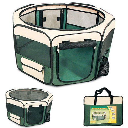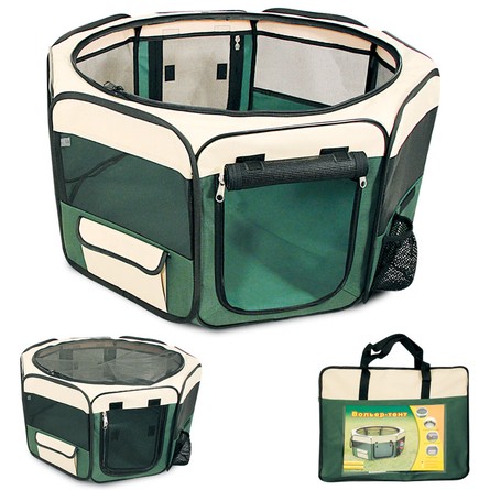 Удобный складной матерчатый вольер-тент - универсальное решение для владельцев собак. Его можно использовать как на улице, так и в помещении в качестве основного места для собаки. Незаменимым атрибутом дом-тент является для владельцев собак на выставках и при перевозке во время длительных путешествий. Дополнительная сетка (идет в комплекте) не дает возможности животному выбраться, а вшитая металлическая конструкция в разложенном виде крепко натягивает ткань, обеспечивая изделию максимальную устойчивость. Изделие имеет удобное отделение для поилки, съемная сетчатая крыша позволяет питомцу свободно дышать, а непромокаемое дно надежно фиксируется при помощи липучек и легко стирается в стиральной машине. Цвет: бежево-зеленый. Размер: 1160х1160х490мм