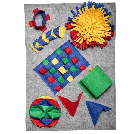 Нюхательный коврик - это уникальный комплекс развивающих упражнений для развития мозговой деятельности питомца. Выполняя упражнения, питомец вынюхивает вкусняшку и думает, как заполучить желаемую цель. Материал, из которого изготовлен нюхательный коврик - экологичное и гипоаллергенное синтетическое полотно, которое применяется при создании детских развивающих игрушек.