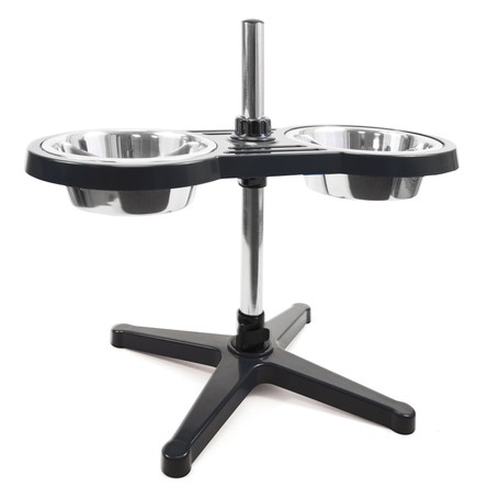 Комплект стойка с мисками "Универсал" с возможностью регулировки высоты мисок 18-50см. Стойка отличается повышенной устойчивостью за счет продуманных габаритов основания. Прорезиненные края металлических мисок поглощают звуки. Детали изделия выполнены с заботой об окружающей среде из экологически чистого переработанного материала - пластмассы. Комплектность: основание, штанга, пластмассовые кольца, 2 миски, фурнитура. Цвет: серебристо-черный. Объем: 2*1,9л, диаметр миски: 215мм; диаметр основания стойки: 460мм; ширина основания: 325мм.