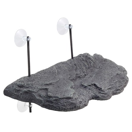 Плавающий плотик для водных черепах. Пластиковые направляющие крепятся к стенкам акватеррариума с помощью присосок, по направляющим свободно перемещается плотик, держащийся на поверхности воды за счет пористой структуры. При оформлении плотика применяется краска, устойчивая к механическому истиранию. Неровная поверхность имитирует скалистый берег.