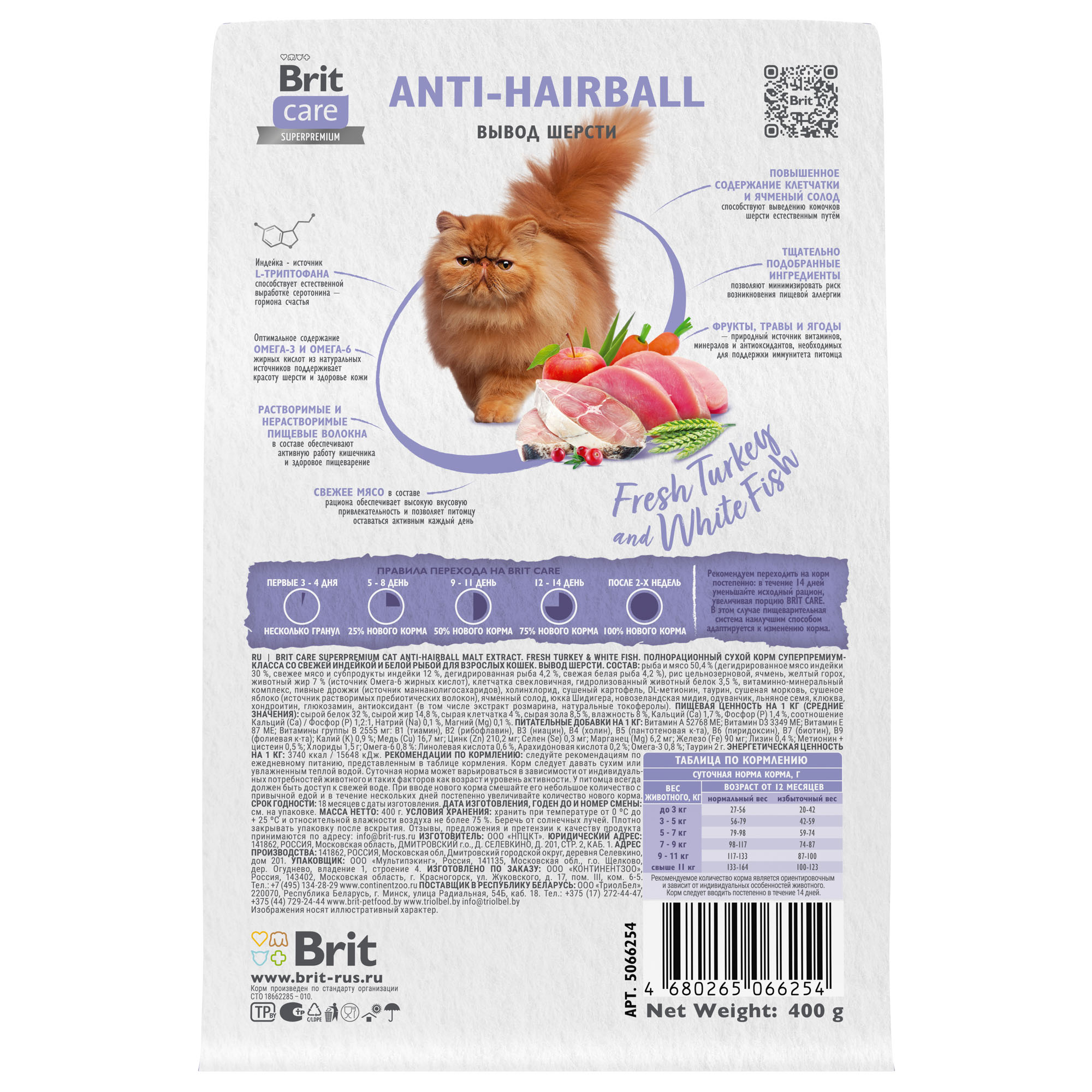 BRIT CARE, Сухой корм с белой рыбой и индейкой для взр.кошек "Cat Anti-Hairball ", 0.4 кг, 5066254