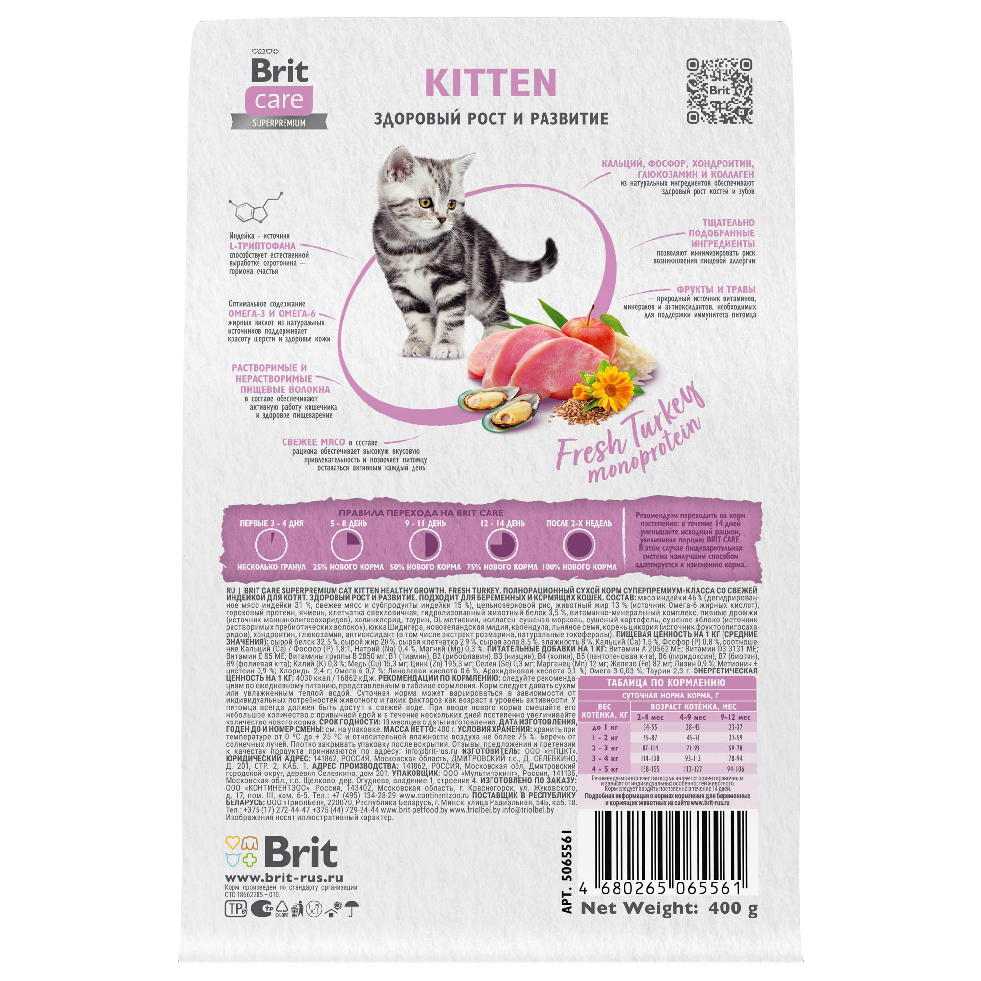 BRIT CARE, Сухой корм с индейкой д/котят, бер.и корм.кош "Cat Kitten Healthy Growth", 0.4кг, 5065561