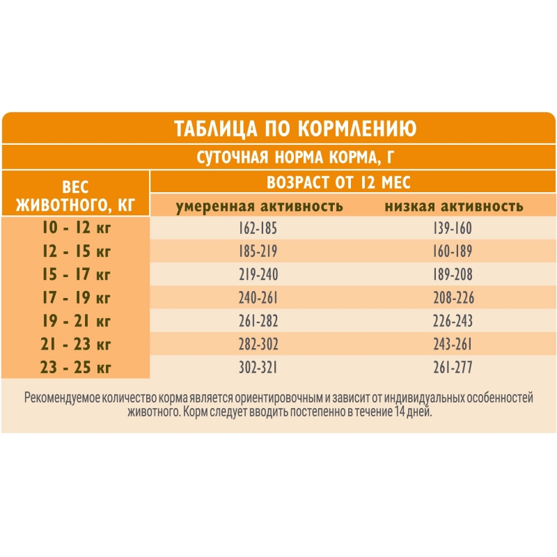 Состав: Мясо индейки 41 % (дегидрированное мясо индейки 26 %, свежее мясо и субпродукты индейки 15 %), ячмень, рис цельнозерновой, желтый горох, животный жир 8% (источник Омега-6 жирных кислот), гидролизованный животный белок 3 %, витаминно-минеральный комплекс, дрожжи инактивированные (источник маннанолигосахаридов), клетчатка свекловичная, рыбий жир (источник Омега-3 жирных кислот), корень цикория (источник фруктоолигосахаридов), холинхлорид, сушеное яблоко (источник растворимых пребиотических волокон), сушеный картофель, сушеная морковь, DL-метионин, юкка Шидигера, новозеландская мидия, одуванчик, льняное семя, розмарин, хондроитин, глюкозамин, антиоксидант (в том числе экстракт розмарина, натуральные токоферолы).