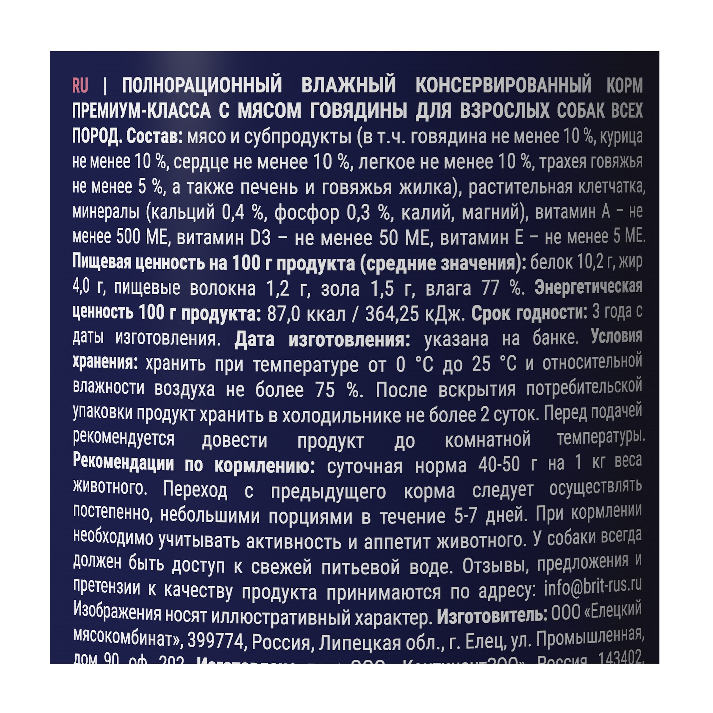Свежее мясо говядины гарантирует потрясающий вкус и соблазнительный аромат. Пребиотики обеспечивают здоровое пищеварение собаки. Консервированный корм содержит все необходимые витамины и минералы, которые требуются для ежедневного питания. Оптимальная разовая порция для собак весом от 10 кг.