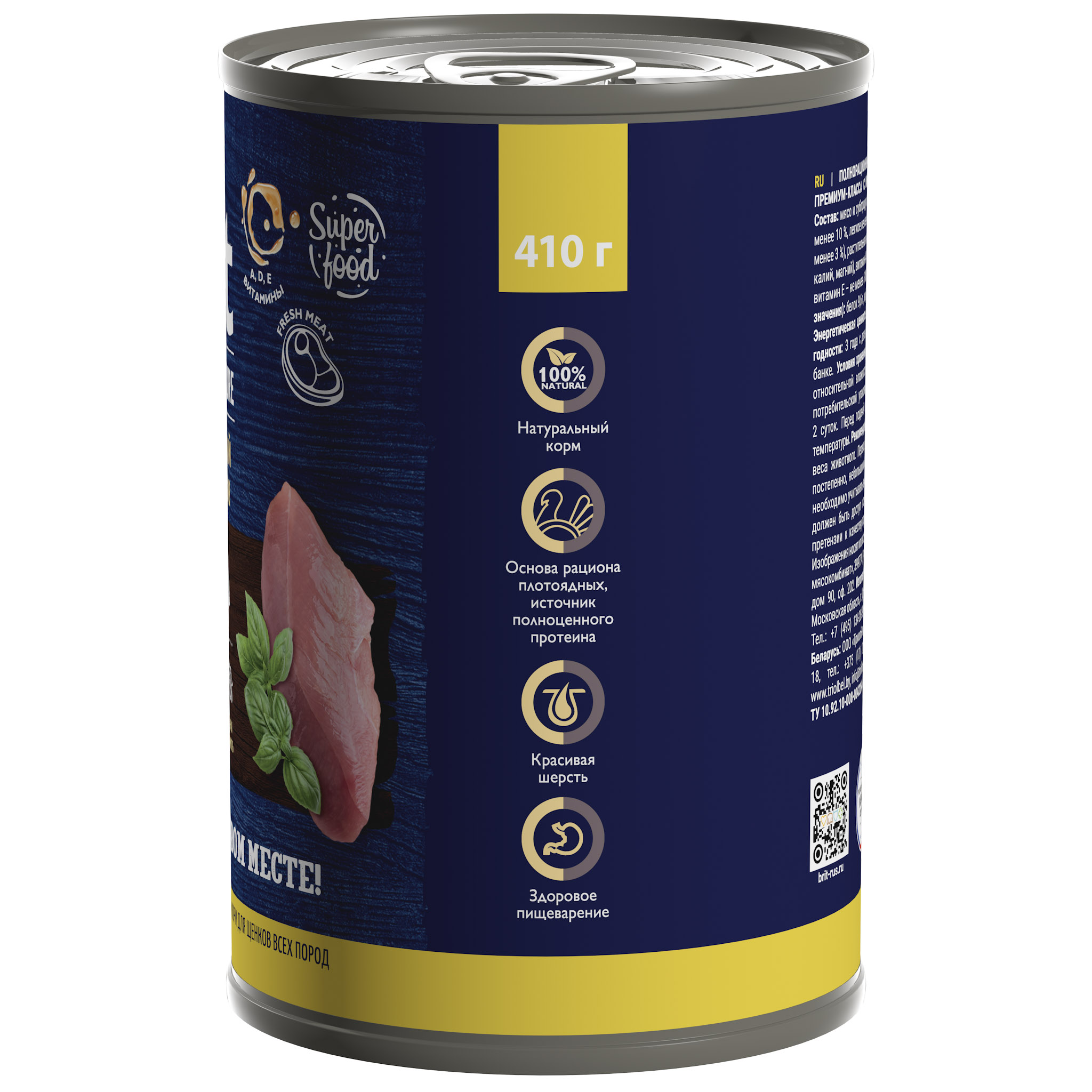 Свежее мясо индейки гарантирует потрясающий вкус и соблазнительный аромат. Пребиотики обеспечивают здоровое пищеварение собаки. Консервированный корм содержит все необходимые витамины и минералы, которые требуются для ежедневного питания. Оптимальная разовая порция для собак весом от 10 кг.