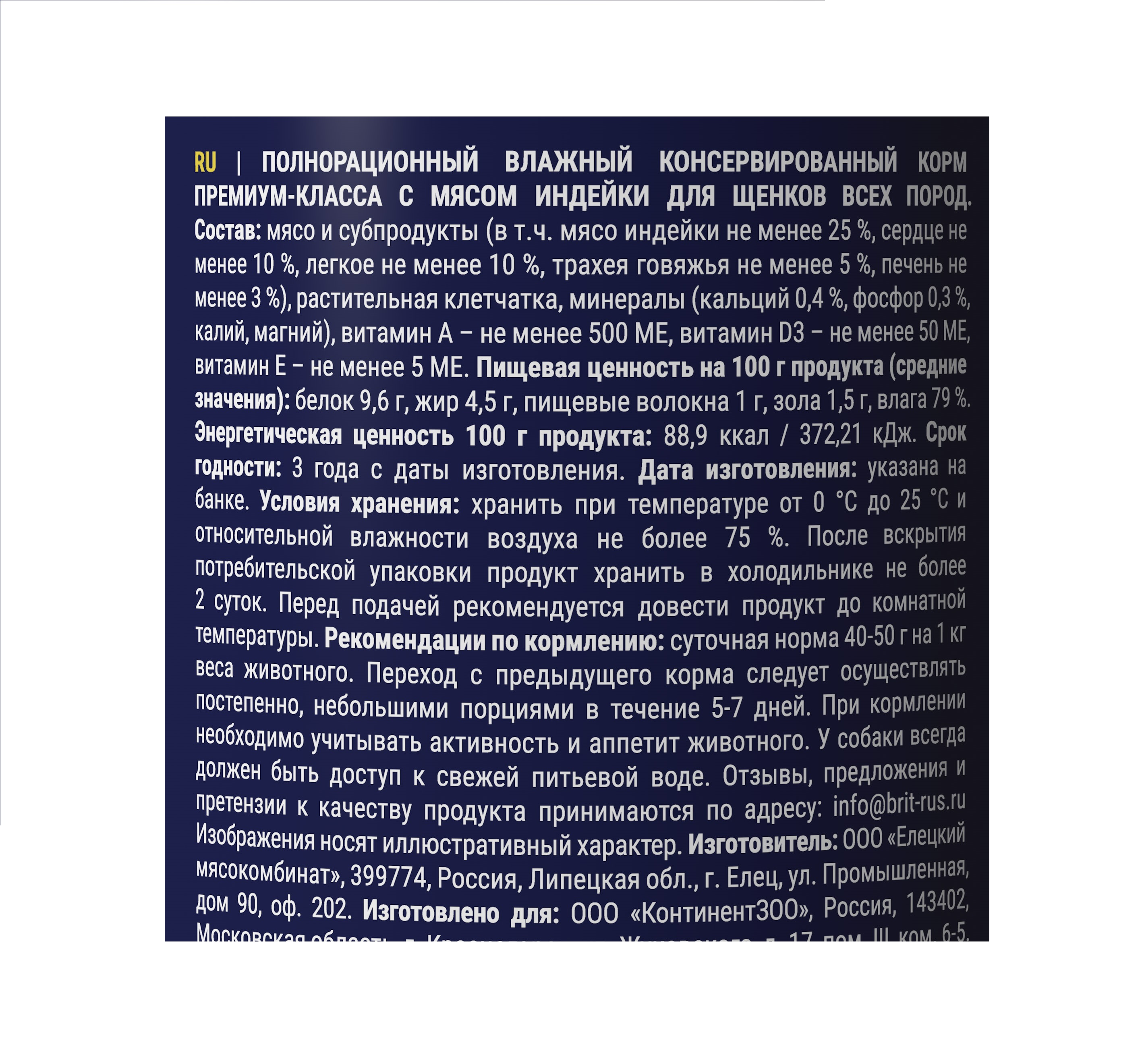 Состав: Мясо и субпродукты (в т.ч. мясо индейки не менее 25 %, сердце не менее 10 %, легкое не менее 10 %, трахея говяжья не менее 5 %, печень не менее 3 %), растительная клетчатка, минералы (Кальций (Ca) 0,4 %, Фосфор (P) 0,3 %, Калий (K), Магний (Mg), Витамин А – не менее 500 МЕ, Витамин D3 – не менее 50 ME, Витамин Е – не менее 5 МЕ.