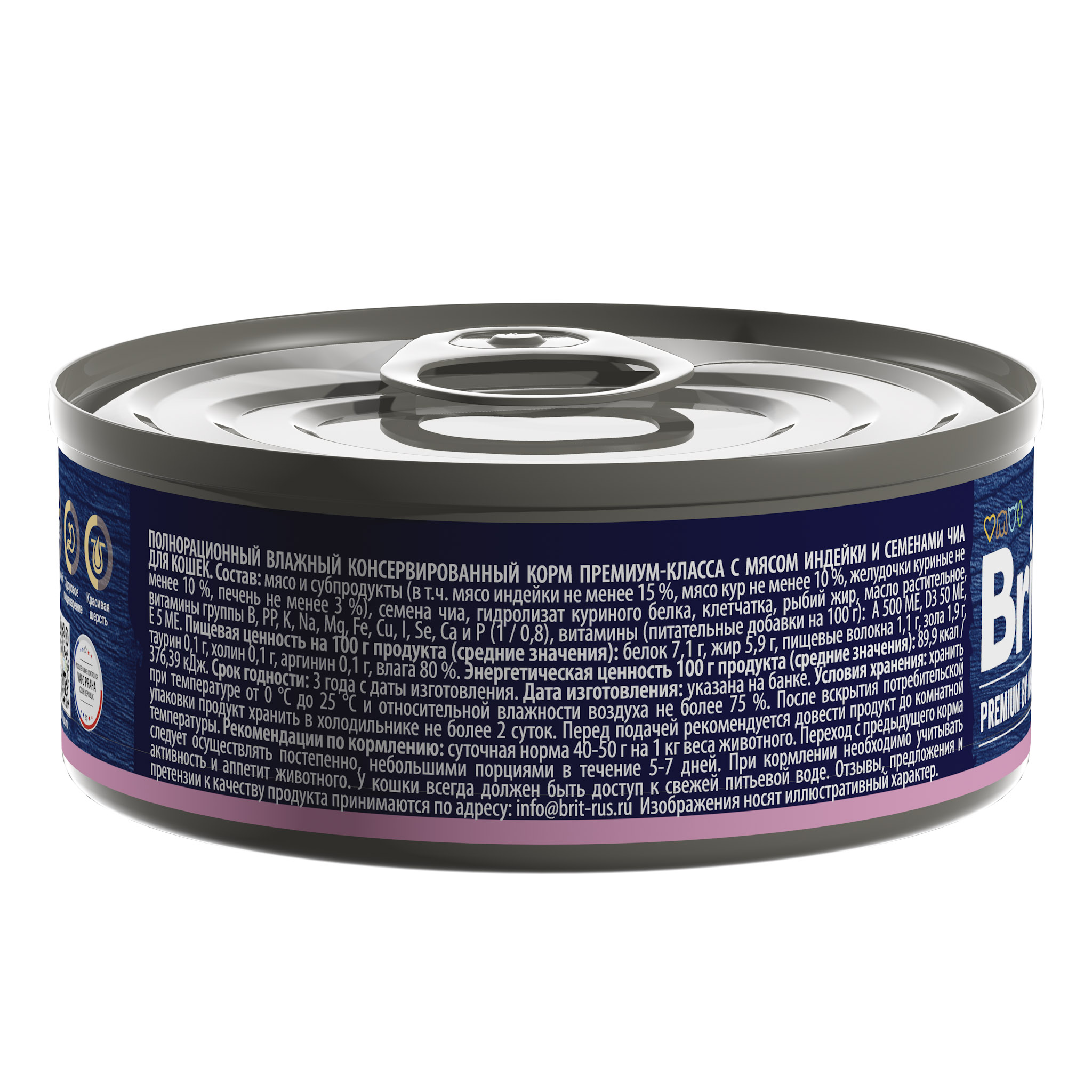 BRIT PREMIUM BY NATURE, Консервы с мясом индейки и семенами чиа для кошек, 100г, 5051243