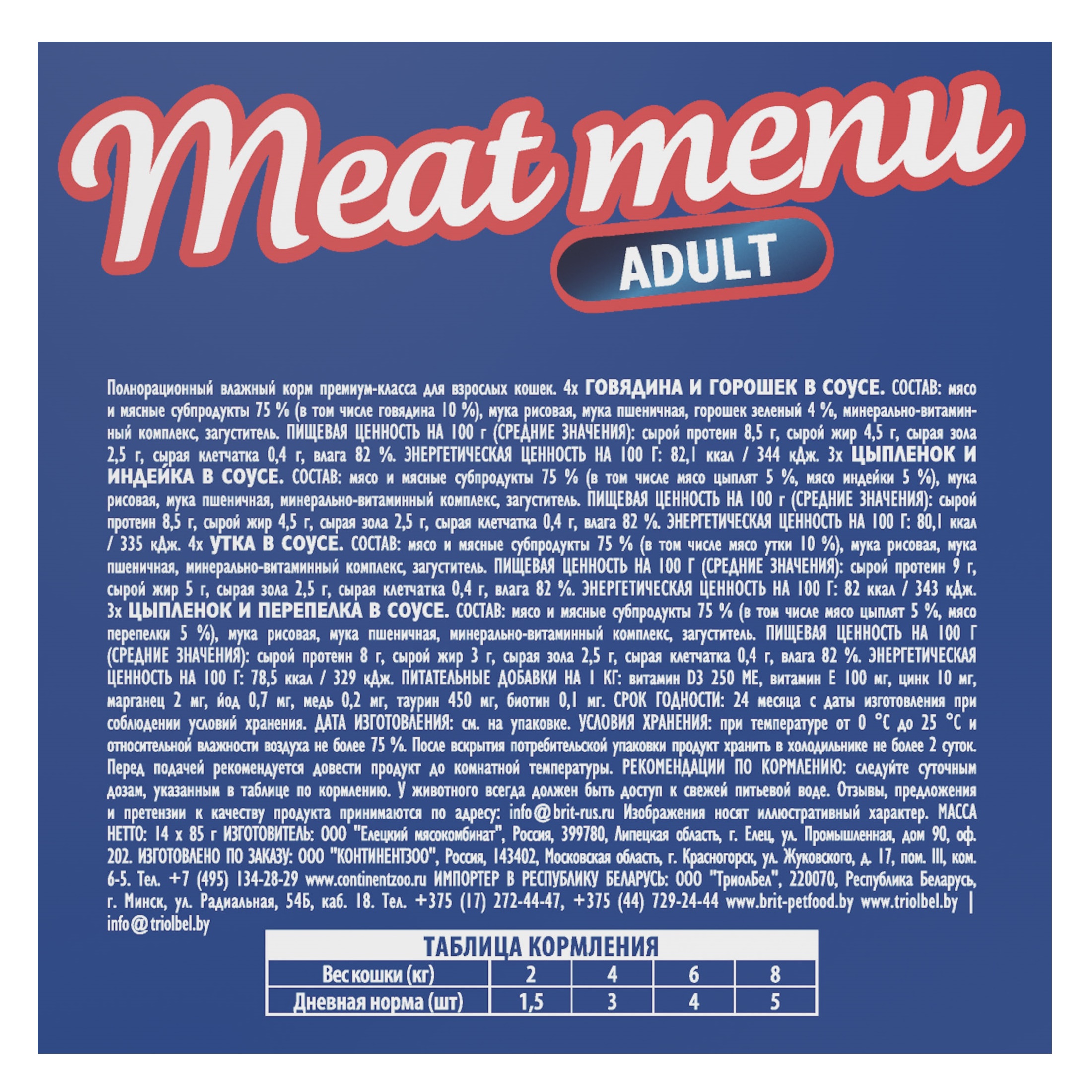 Мясное меню в соусе для взрослых кошек — это разнообразное меню на каждый день для вашего питомца. Идеально сбалансированные составы с аппетитными мясными кусочками в сочном соусе придутся по вкусу даже самой привередливой кошке. Каждый день — новое блюдо! В Меню для взрослых кошек входит 14 паучей по 85 грамм: • Цыпленок и индейка в соусе – 3 шт • Цыпленок и перепелка в соусе – 3 шт • Утка в соусе – 4 шт • Говядина и горошек в соусе – 4 шт