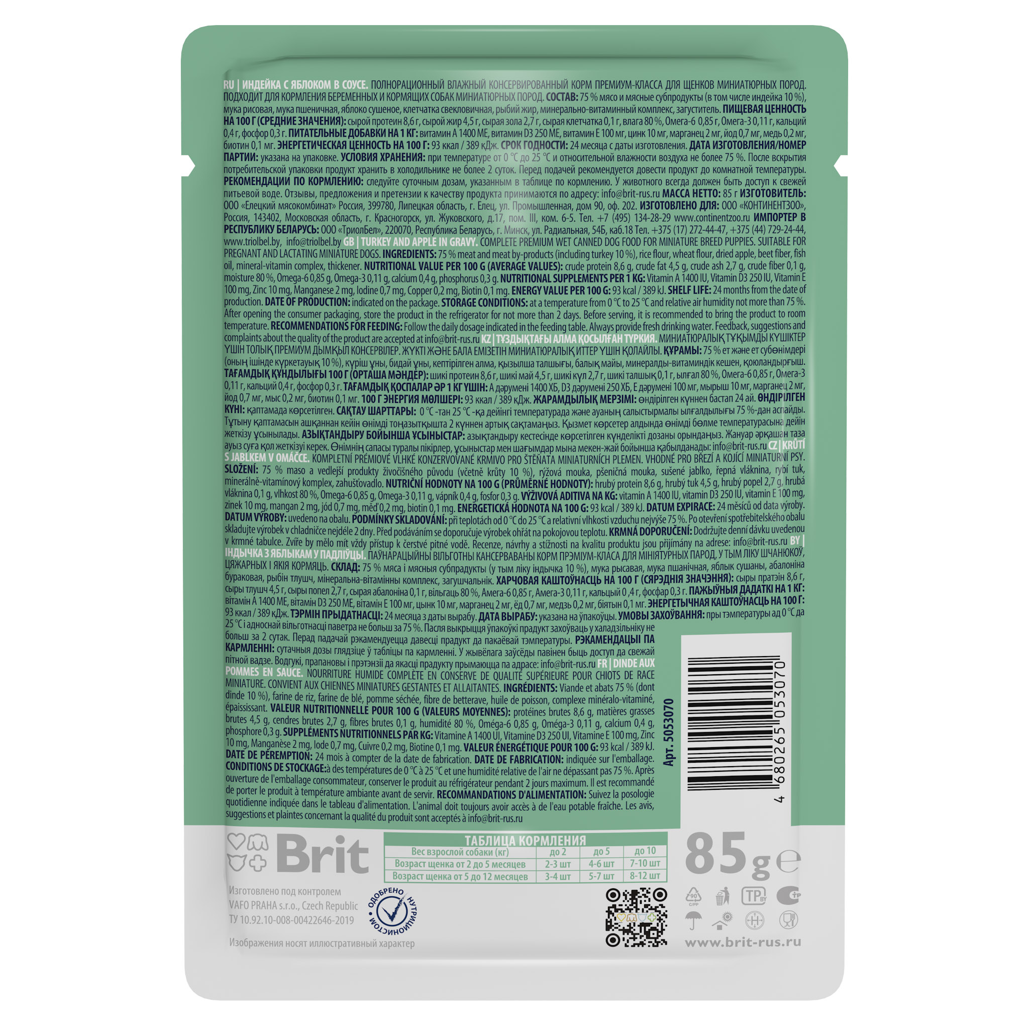 BRIT PREMIUM, Пауч для щенков мини пород, Индейка с яблоком в соусе, 85г, 5053070