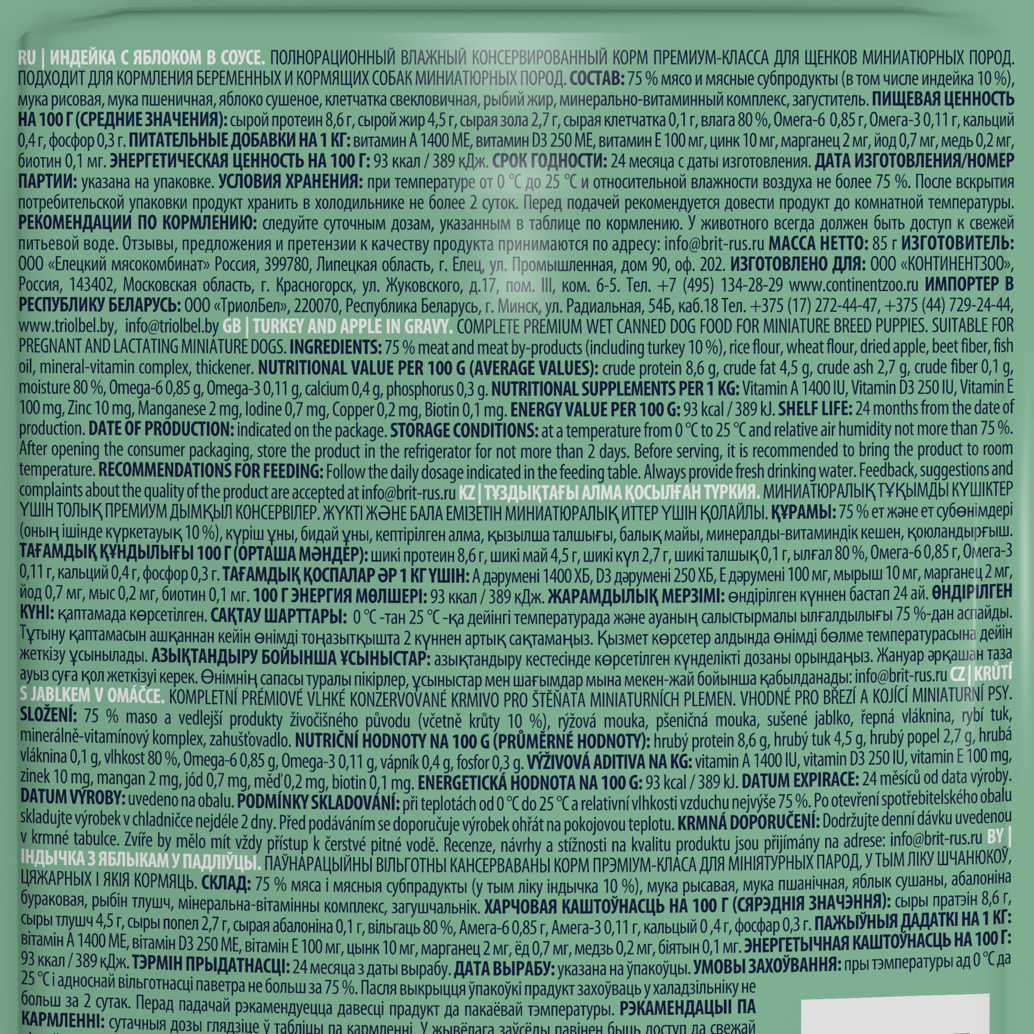 Состав: 75% мясо и мясные субпродукты (в том числе индейка 10 %), мука рисовая, мука пшеничная, яблоко сушеное, клетчатка свекловичная, рыбий жир, минерально-витаминный комплекс, загуститель.