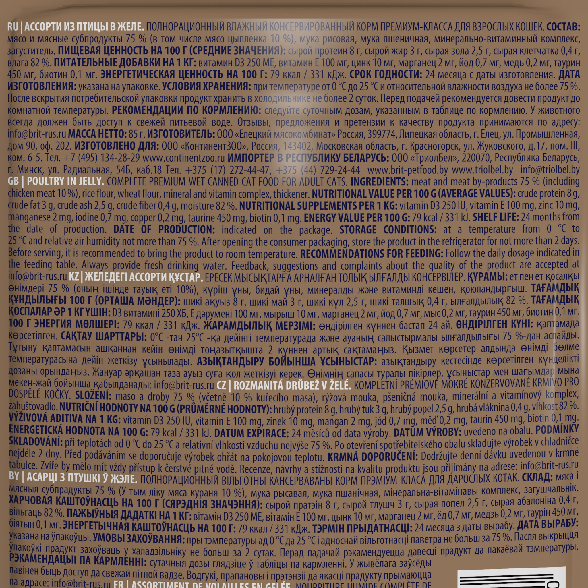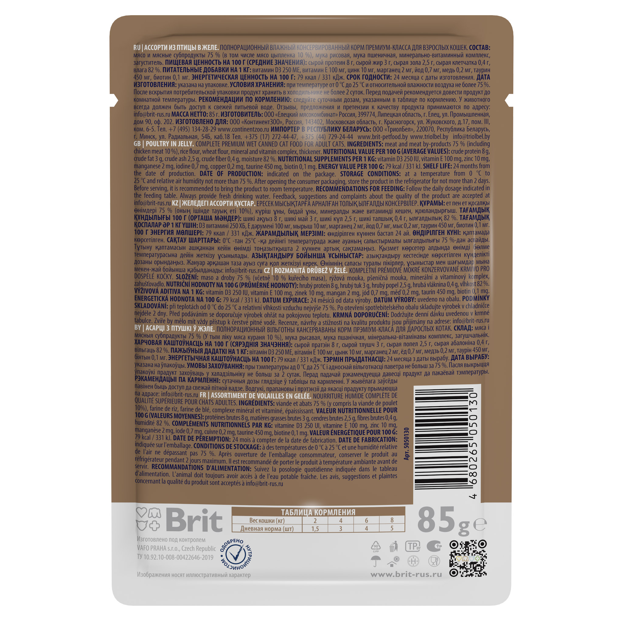 BRIT PREMIUM, Пауч для взрослых кошек, Ассорти из птицы в желе, 85г, 5050130