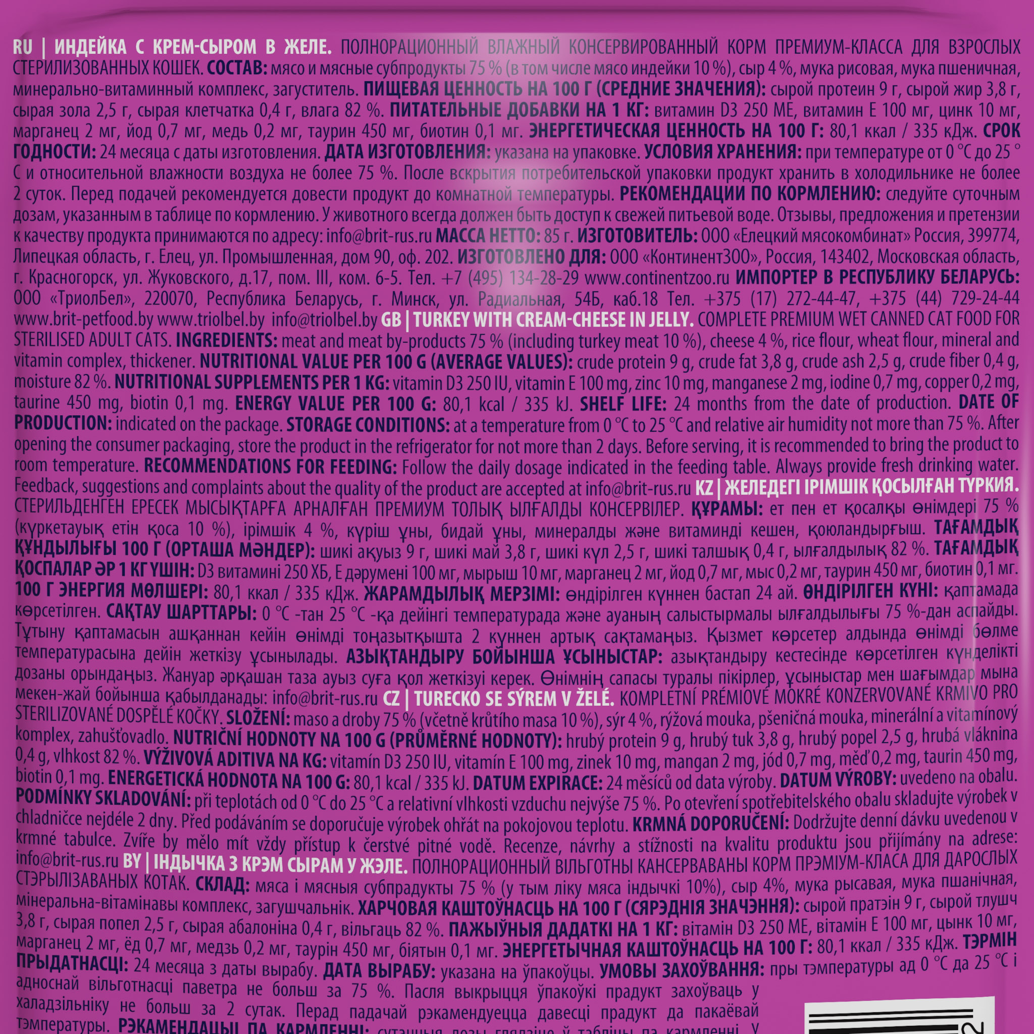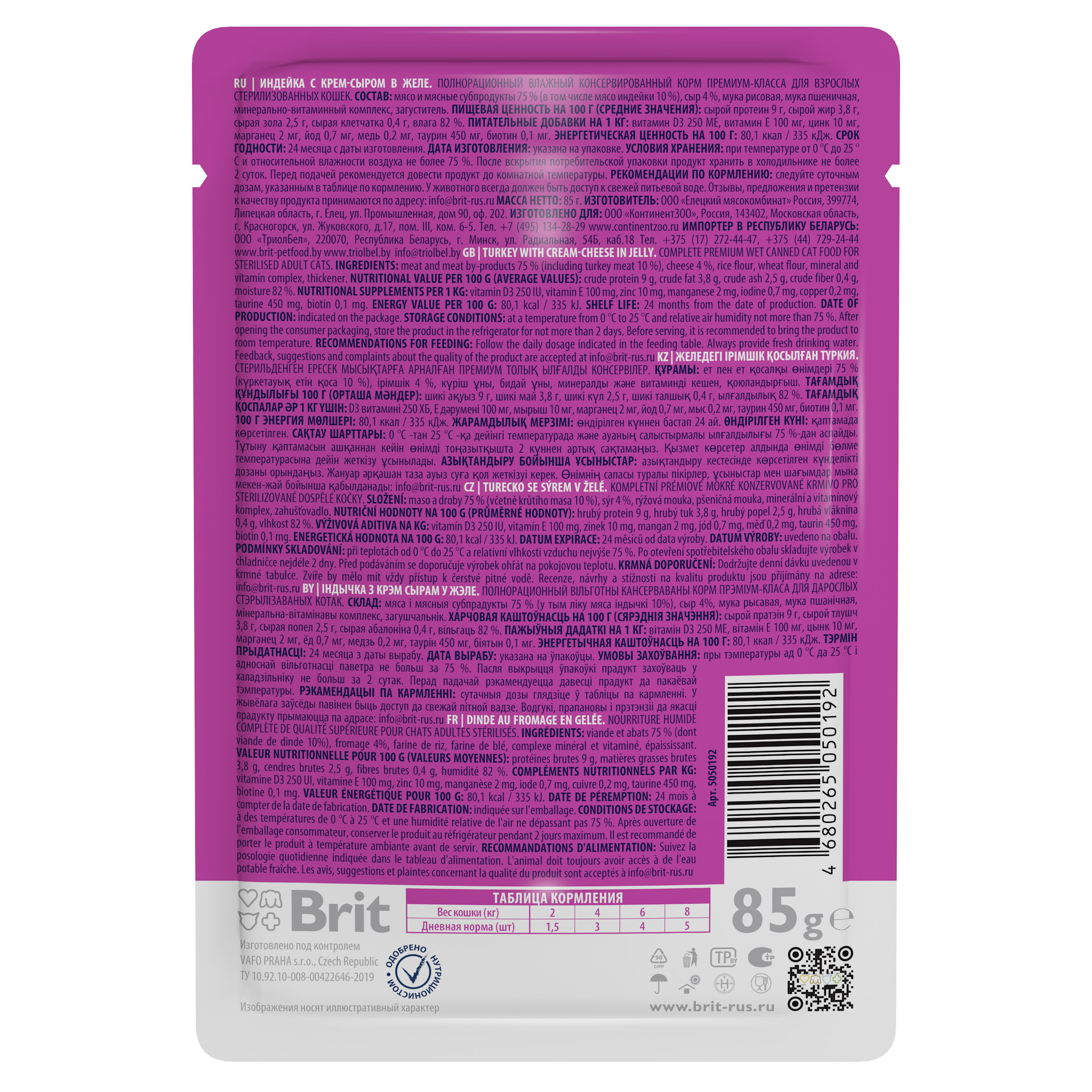 BRIT PREMIUM, Пауч для взрослых стерилизованных кошек, Индейка с сыром в желе, 85г, 5050192