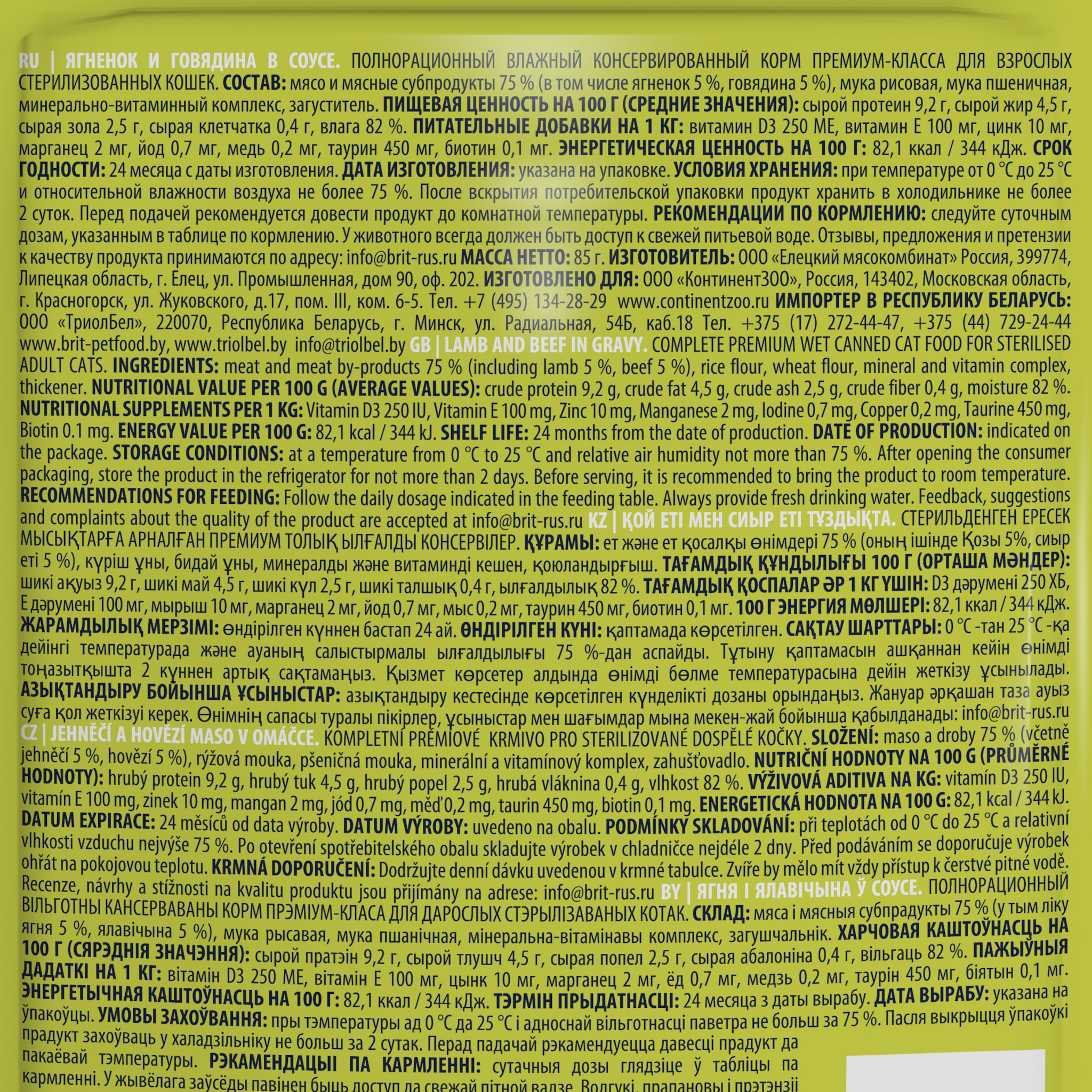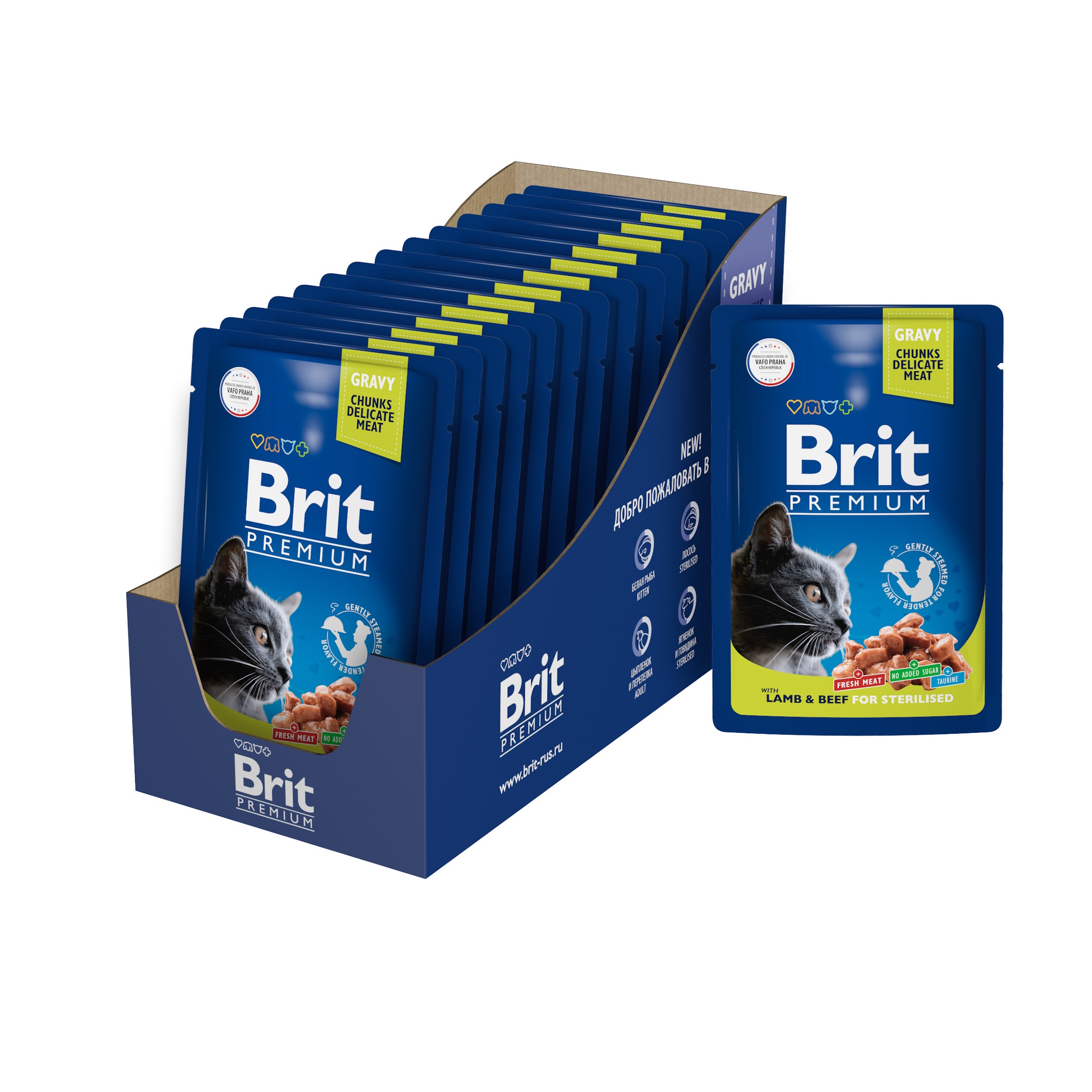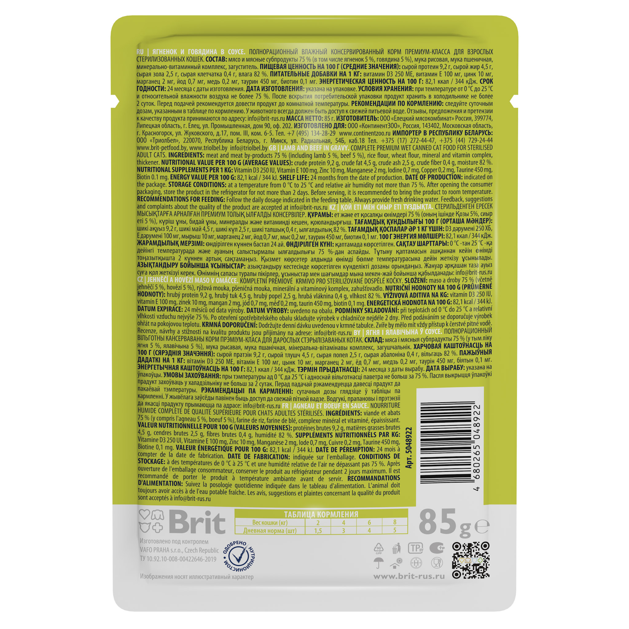 BRIT PREMIUM, Пауч для взрослых стерилизованных кошек, Ягнёнок и говядина в соусе, 85г, 5048922