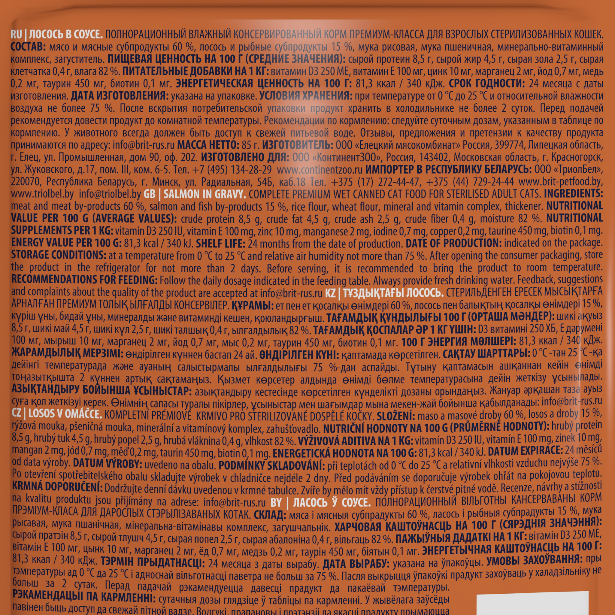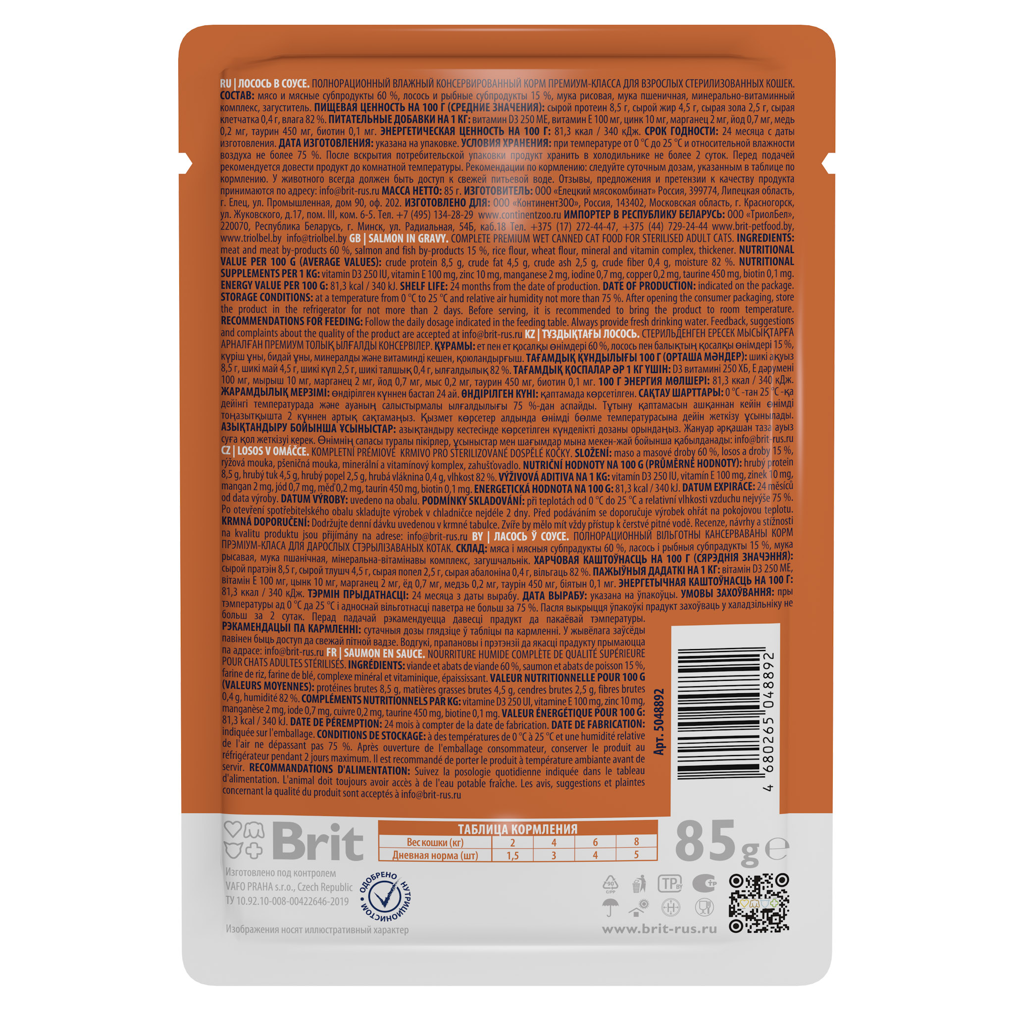 BRIT PREMIUM, Пауч для взрослых стерилизованных кошек, Лосось в соусе, 85г, 5048892