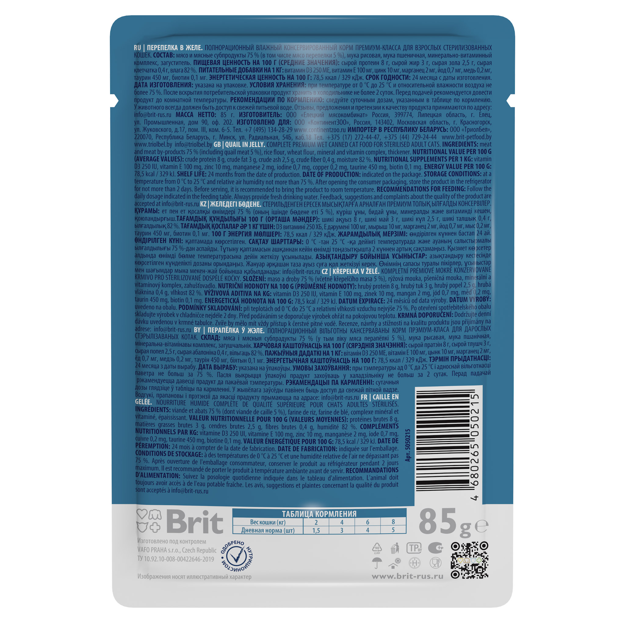 BRIT PREMIUM, Пауч для взрослых стерилизованных кошек, Перепёлка в желе, 85г, 5050215