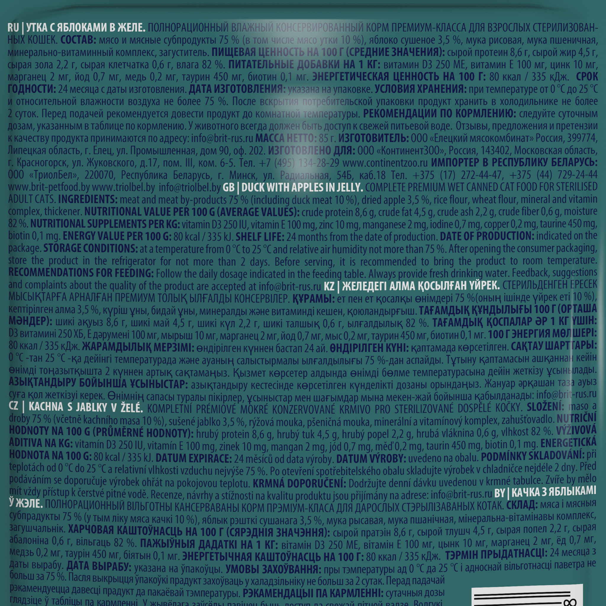BRIT PREMIUM, Пауч для взрослых стерилизованных кошек, Утка с яблоками в желе, 85г, 5050208