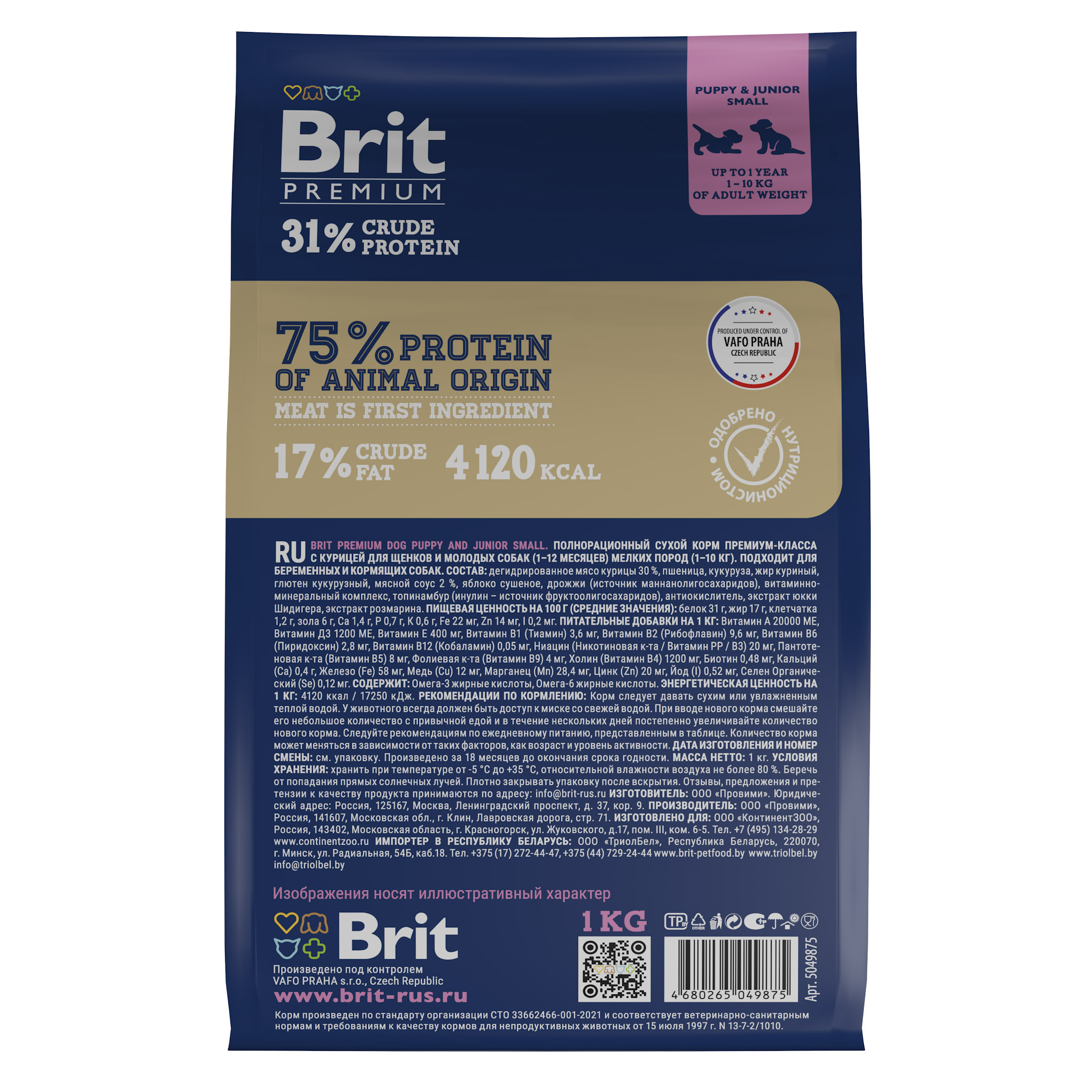 BRIT PREMIUM, Сухой корм с курицей для щенков "Dog Puppy and Junior Small", 1кг, 5049875