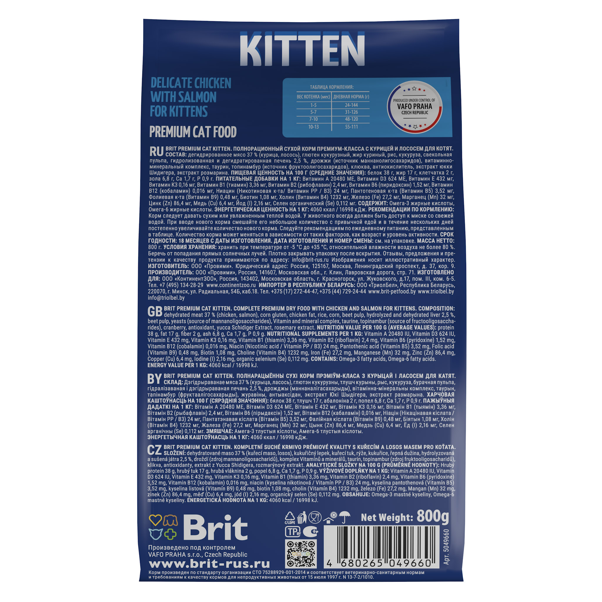 BRIT PREMIUM, Сухой корм с курицей и лососем для котят "Cat Kitten", 0.8кг, 5049660