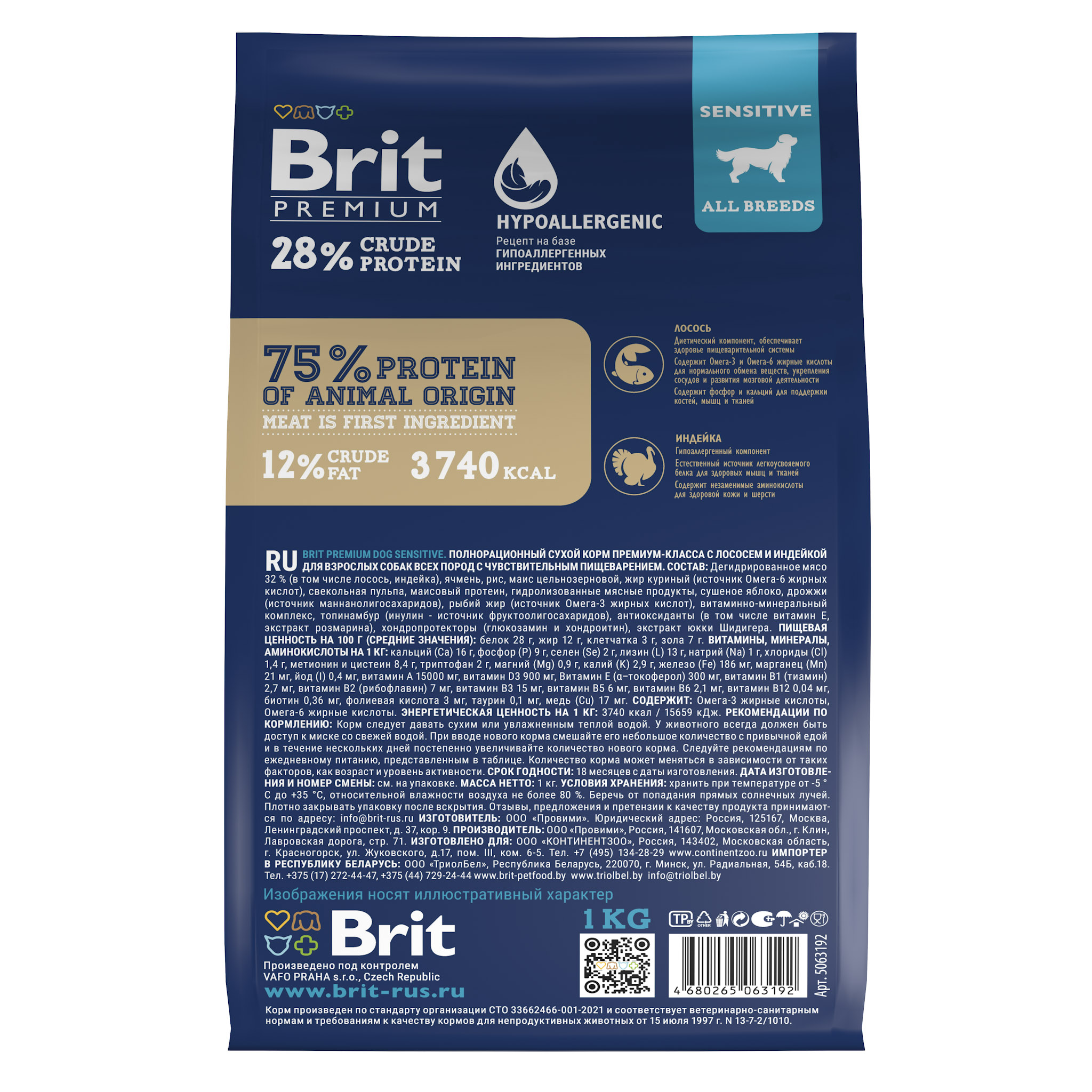Brit Premium Dog Sensitive. Полнорационный сухой корм премиум-класса с индейкой и лососем для взрослых собак всех пород с чувствительным пищеварением, 1 кг Ингредиенты со сниженной аллергенной нагрузкой — низкий риск пищевой аллергии и непереносимости. Отсутствие курицы и пшеницы в составе профилактирует риски пищевой аллергии к куриному белку и глютену. Комбинация злаков с различным гликемическим индексом снижает нагрузку на поджелудочную железу и уменьшаем риск сахарного диабета. Корм следует давать сухим или увлажненным теплой водой. У животного всегда должен быть доступ к миске со свежей водой.