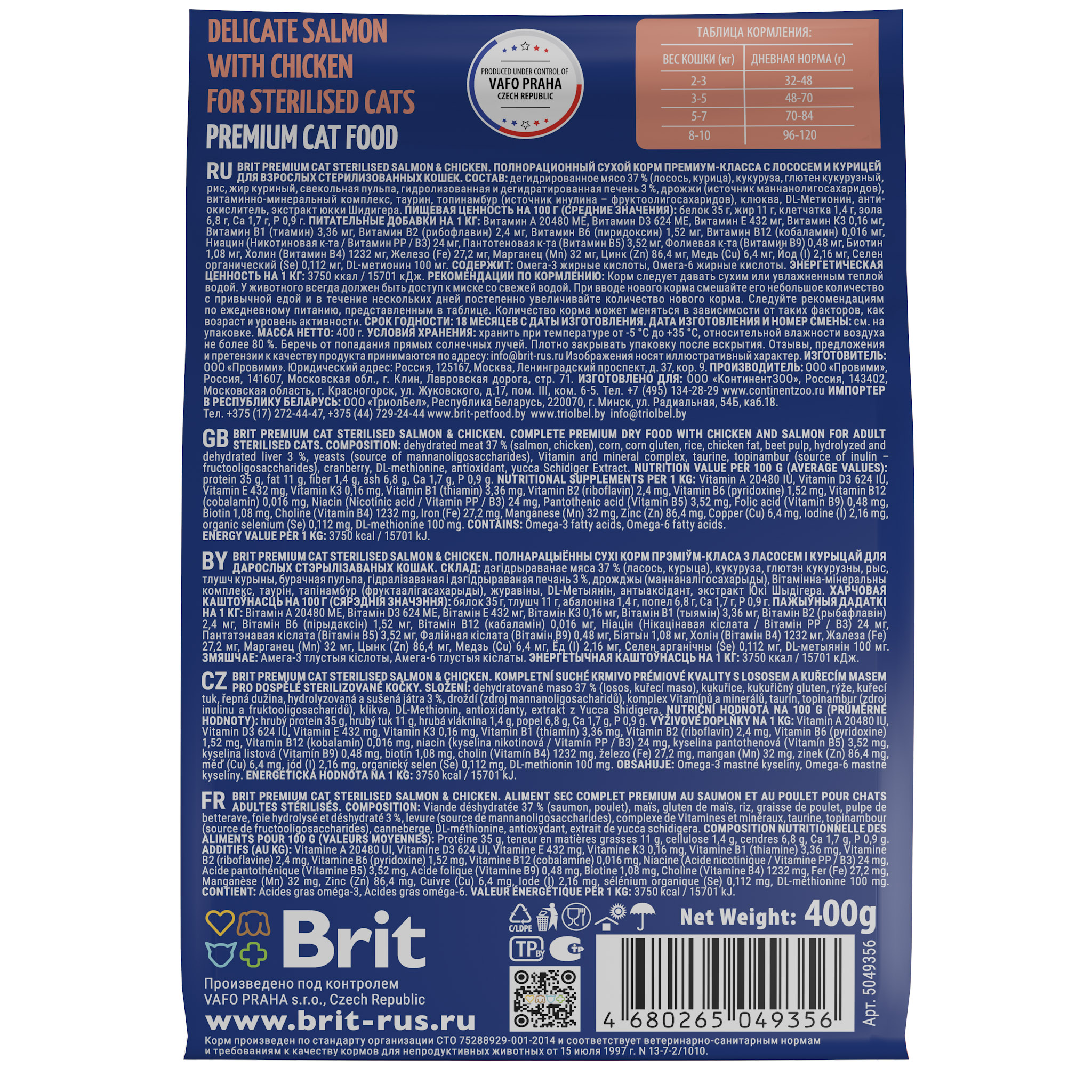 BRIT PREMIUM, Сухой корм с лососем и курицей д/кошек "Cat Sterilised Salmon&Chicken", 0.4кг, 5049356