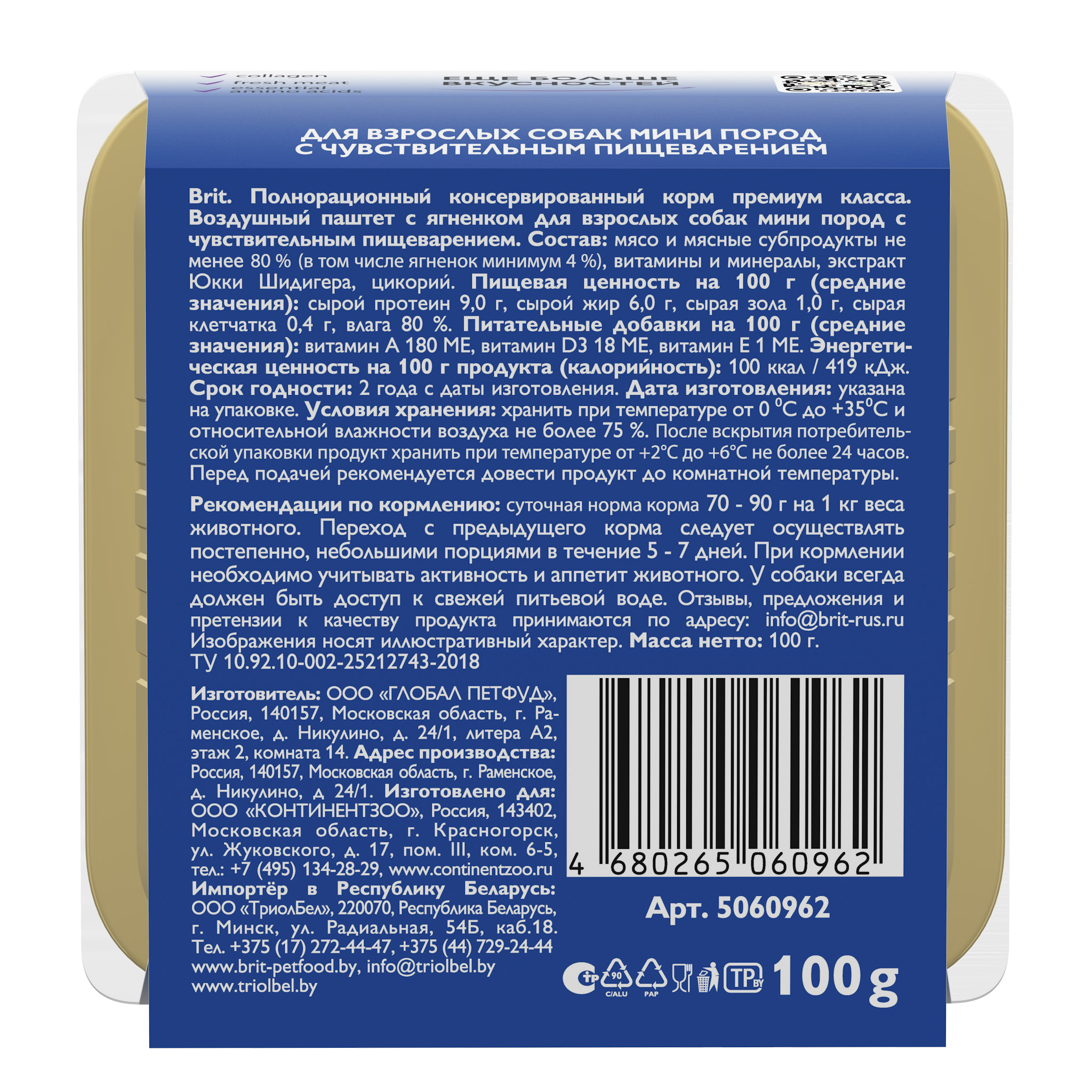 BRIT PREMIUM, Воздушный паштет для собак мини пород с чувств. пищеварением, Ягнёнок, 100г, 5060962