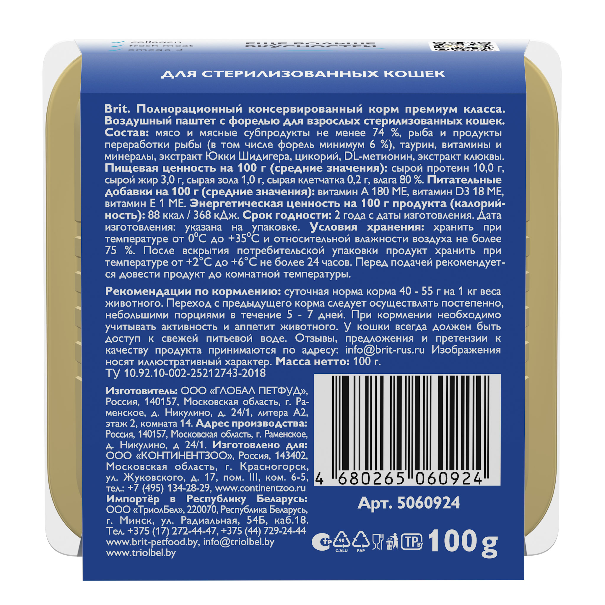 BRIT PREMIUM, Воздушный паштет для стерилизованных кошек, Форель, 100гр, 5060924