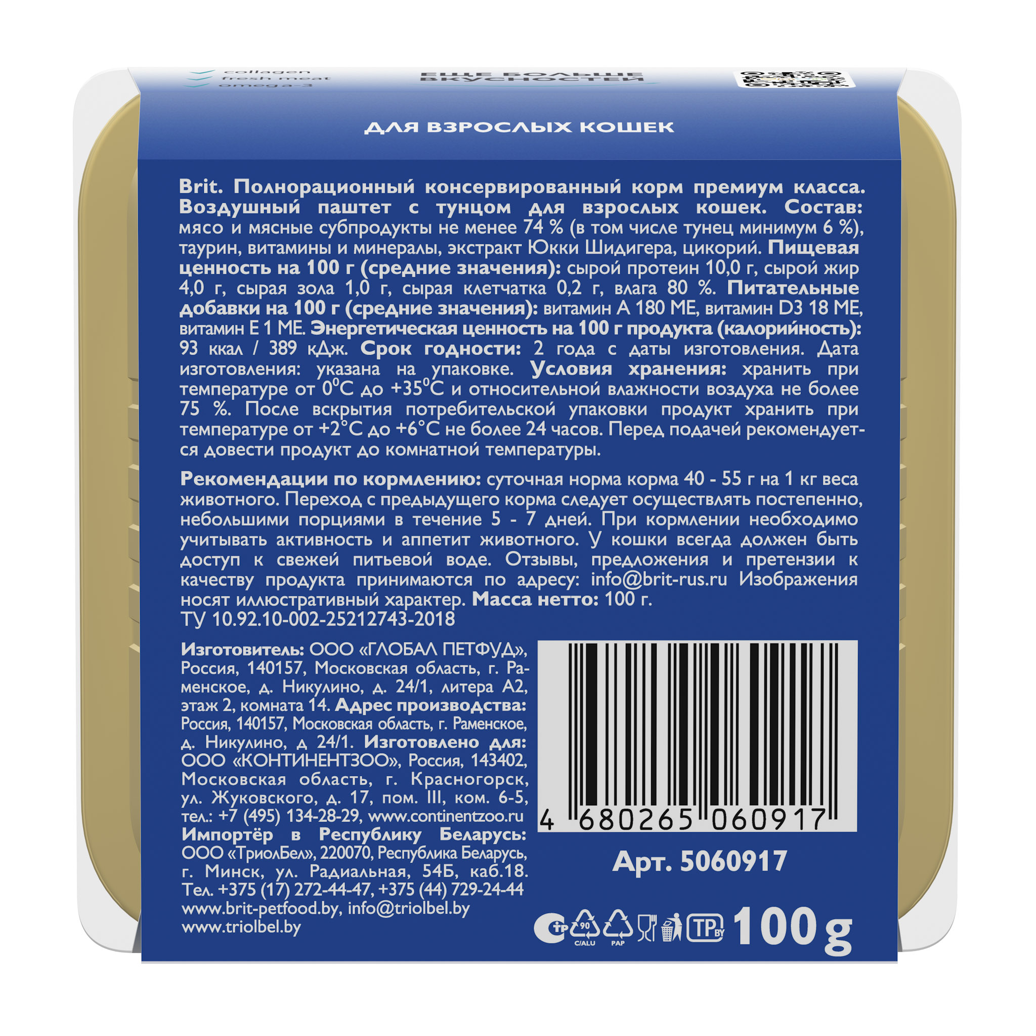 BRIT PREMIUM, Воздушный паштет для взрослых кошек, Тунец, 100г, 5060917