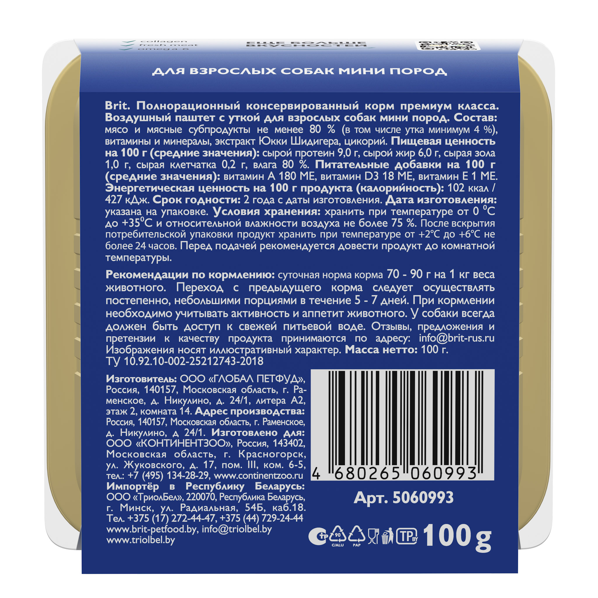 BRIT PREMIUM, Воздушный паштет для взрослых собак мини пород, Утка, 100г, 5060993