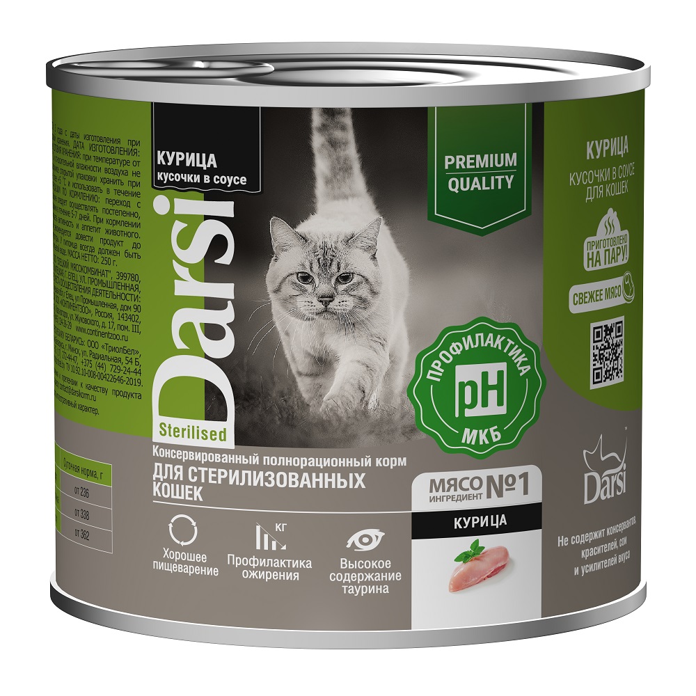 DARSI, Консервы для стерилизованных кошек, Кусочки с Курицей в соусе, 250 г, 40094