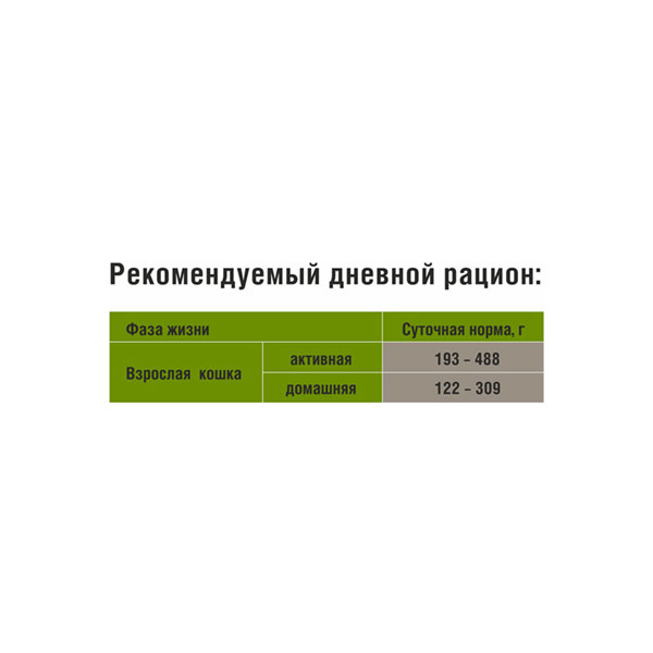 Состав: Состав: мясо и мясные субпродукты 65 % (в том числе курица не менее 25 %), мясной бульон, мука рисовая, мука пшеничная, растительный протеин, плазма крови, растительная клетчатка, таурин, витаминно-минеральный комплекс, натуральный загуститель. Питательные добавки на 1 кг: Витамин А 1500 МЕ, витамин D3 250 МЕ, витамин Е 100 мг, Кальций (Ca) 2 г, Фосфор (P) 1,4 г, Цинк (Zn) 10 мг, Mарганец (Mn) 2 мг, Йод (I) 0,7 мг, Медь (Cu) 0,2 мг, таурин 450 мг, биотин 0,1 мг. Пищевая ценность на 100 г (средние значения): сырой протеин 6 г, сырой жир 3,5 г, сырая зола не более 2,5 г, сырая клетчатка не более 0,3 г, влажность 84%. Энергетическая ценность на 100 г продукта: 67 ккал / 281 кДж.