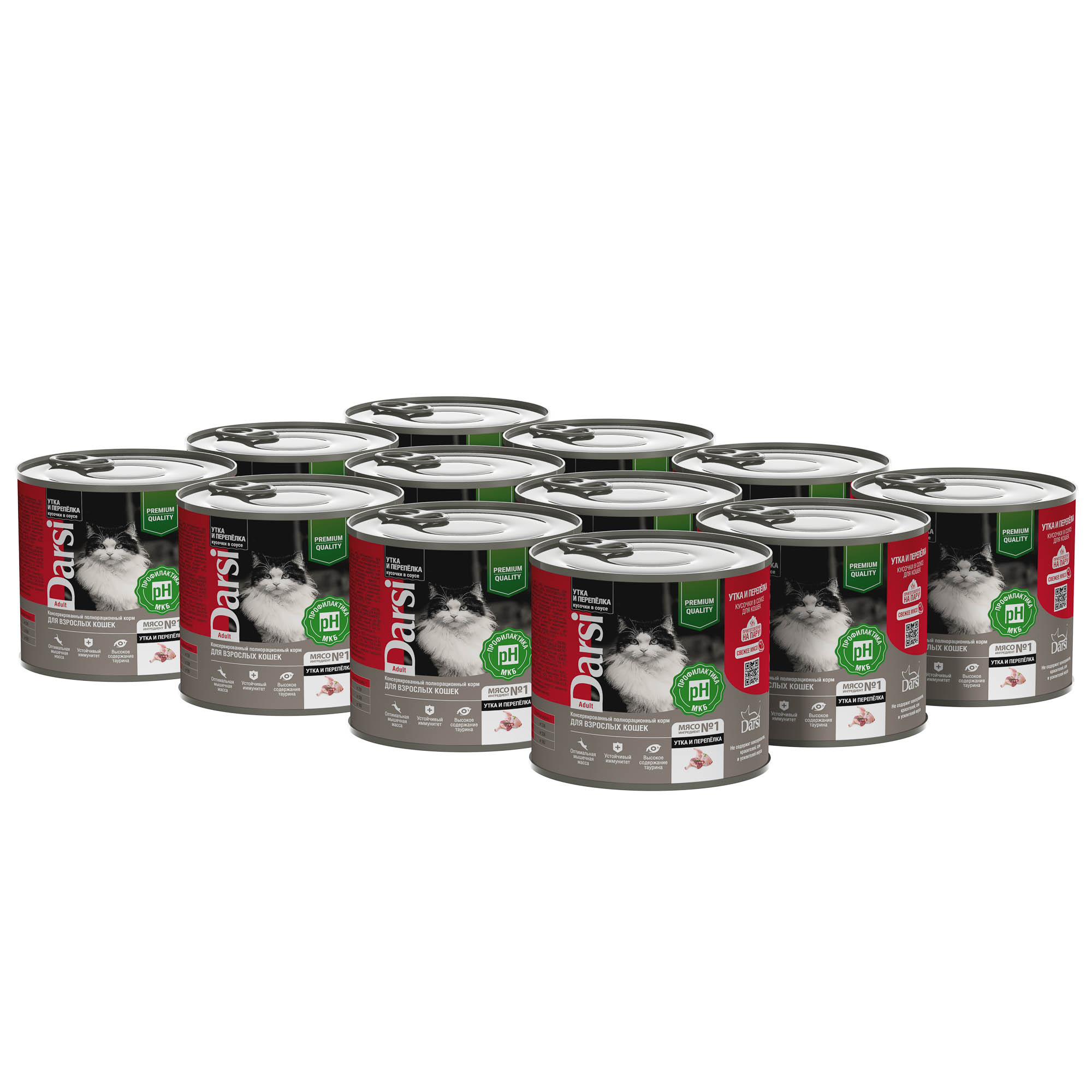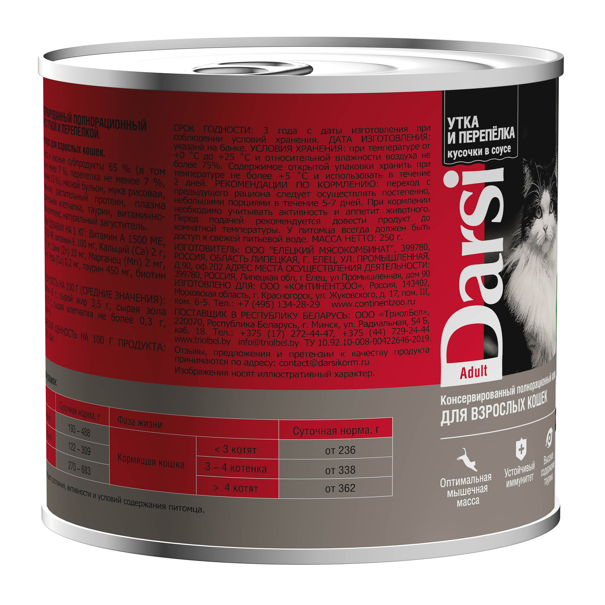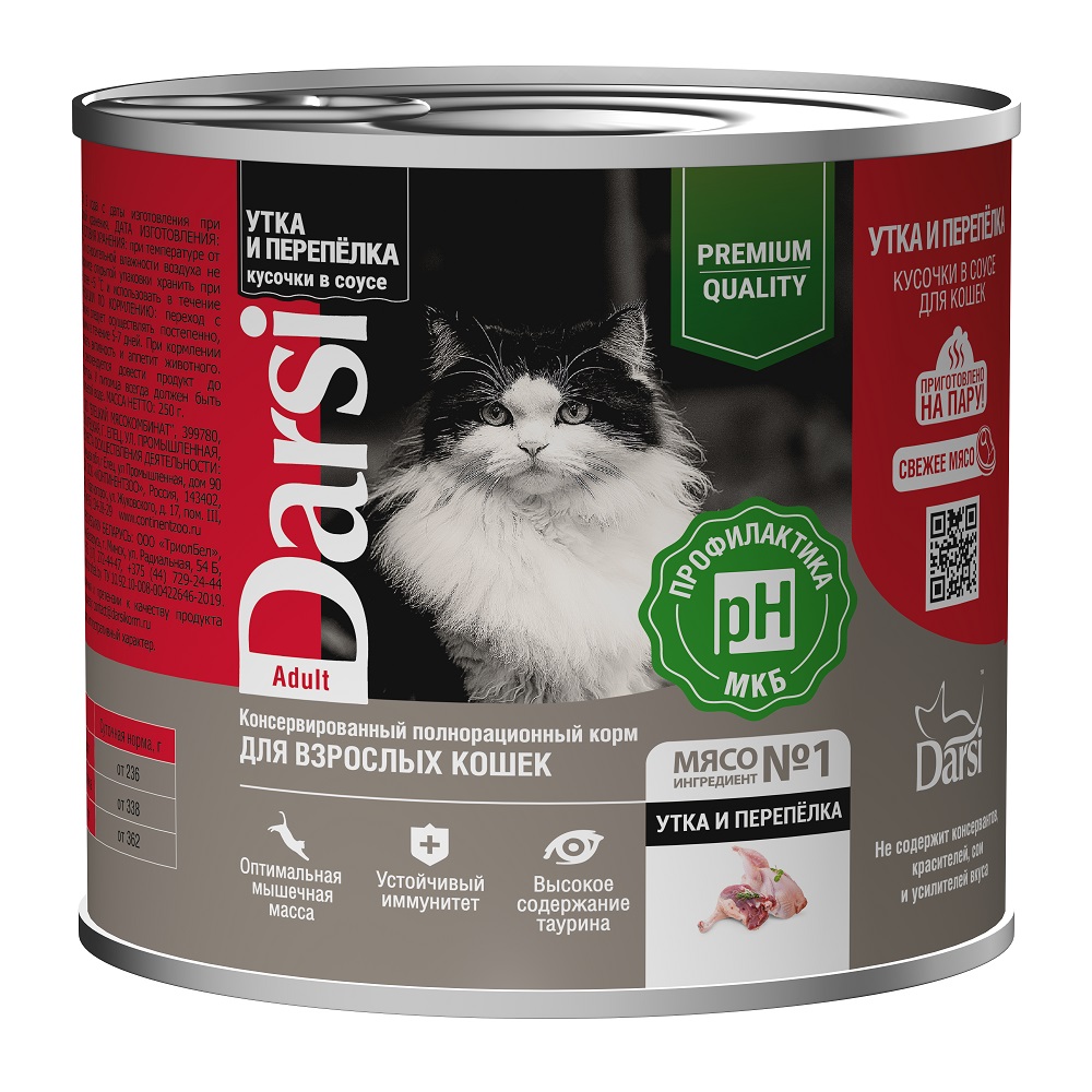 DARSI, Консервы для взрослых кошек, Кусочки с Уткой и Перепелкой в соусе, 250 г, 44009
