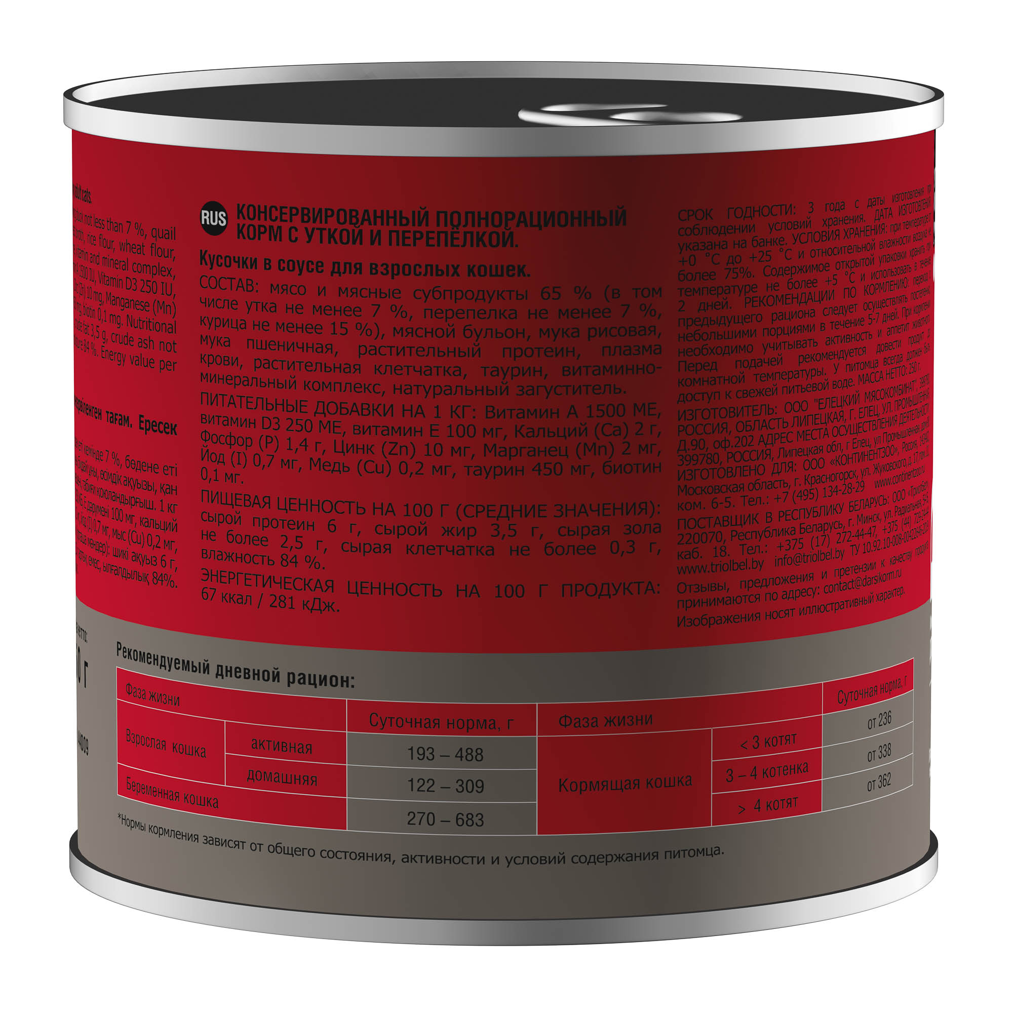 Состав: мясо и мясные субпродукты 65 % (в том числе утка не менее 7 %, перепелка не менее 7 %, курица не менее 15 %), мясной бульон, мука рисовая, мука пшеничная, растительный протеин, плазма крови, растительная клетчатка, таурин, витаминно-минеральный комплекс, натуральный загуститель. Питательные добавки на 1 кг: Витамин А 1500 МЕ, витамин D3 250 МЕ, витамин Е 100 мг, Кальций (Ca) 2 г, Фосфор (P) 1,4 г, Цинк (Zn) 10 мг, Mарганец (Mn) 2 мг, Йод (I) 0,7 мг, Медь (Cu) 0,2 мг, таурин 450 мг, биотин 0,1 мг. Пищевая ценность на 100 г (средние значения): сырой протеин 6 г, сырой жир 3,5 г, сырая зола не более 2,5 г, сырая клетчатка не более 0,3 г, влажность 84 %. Энергетическая ценность на 100 г продукта: 67 ккал / 281 кДж.