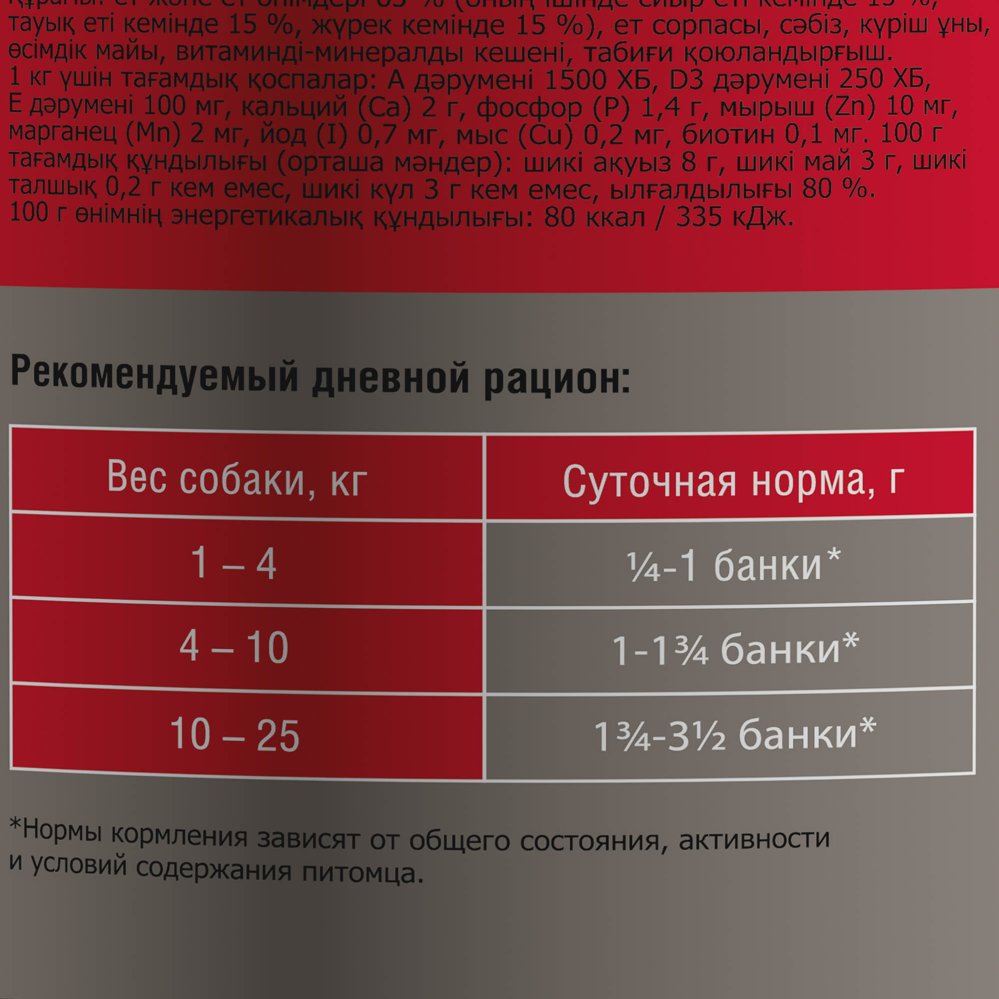Состав: Состав: мясо и мясные субпродукты 65 % (в том числе говядина не менее 15 %, курица не менее 15 %, сердце не менее 15 %), мясной бульон, морковь, рисовая мука, растительное масло, витаминно-минеральный комплекс, натуральный загуститель. Питательные добавки на 1 кг: Витамин А 1500 МЕ, витамин D3 250 МЕ, витамин Е 100 мг, Кальций (Ca) 2 г, Фосфор (P) 1,4 г, Цинк (Zn) 10 мг, Mарганец (Mn) 2 мг, Йод (I) 0,7 мг, Медь (Cu) 0,2 мг, биотин 0,1 мг. Пищевая ценность на 100 г (средние значения): сырой протеин 8 г, сырой жир 3 г, сырая клетчатка не менее 0,2 г, сырая зола не менее 3 г, влажность 80 %. Энергетическая ценность на 100 г продукта: 80 ккал / 335 кДж.