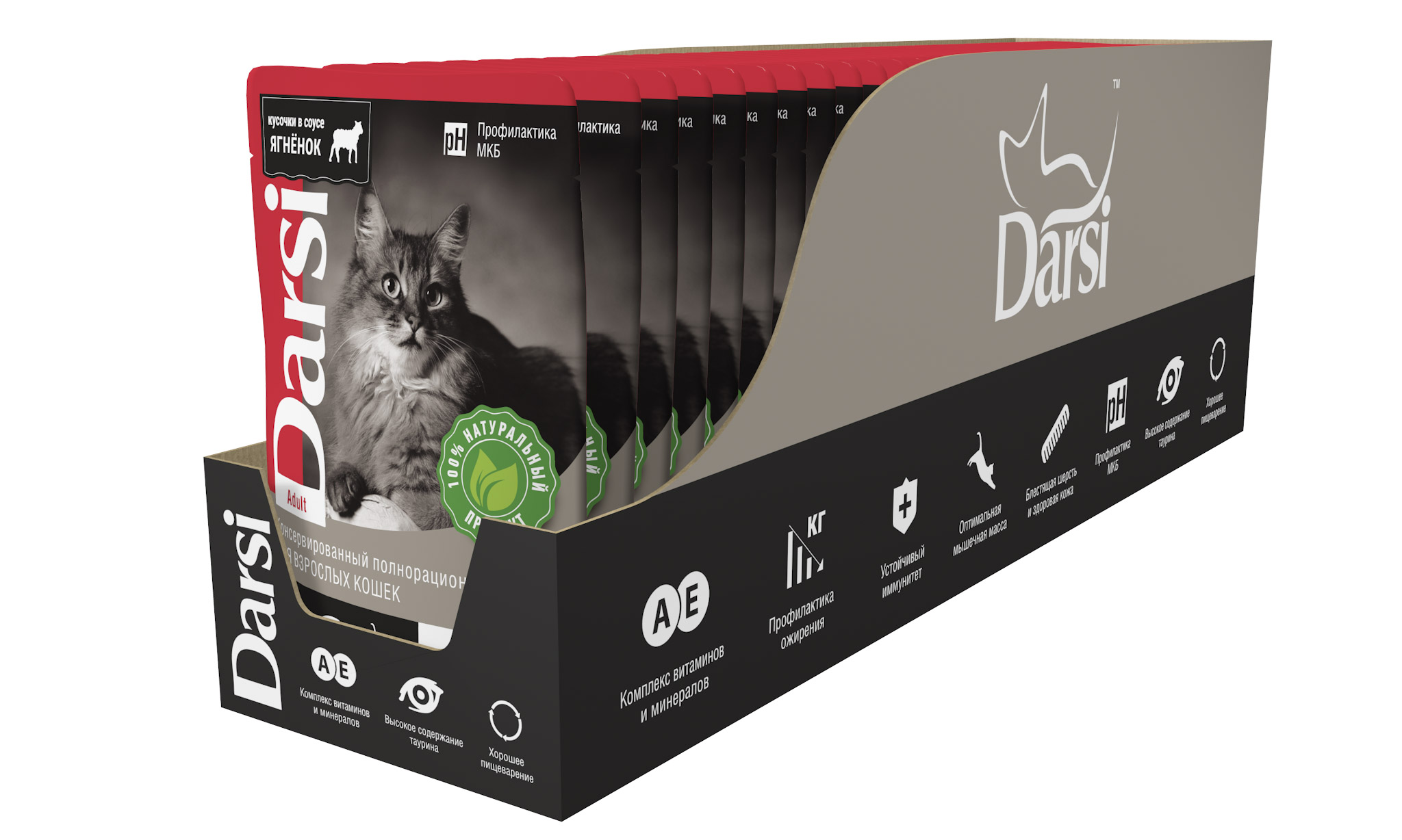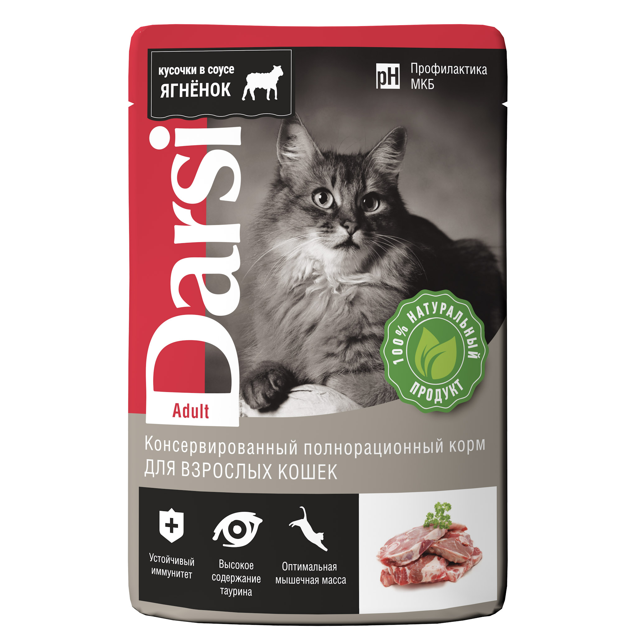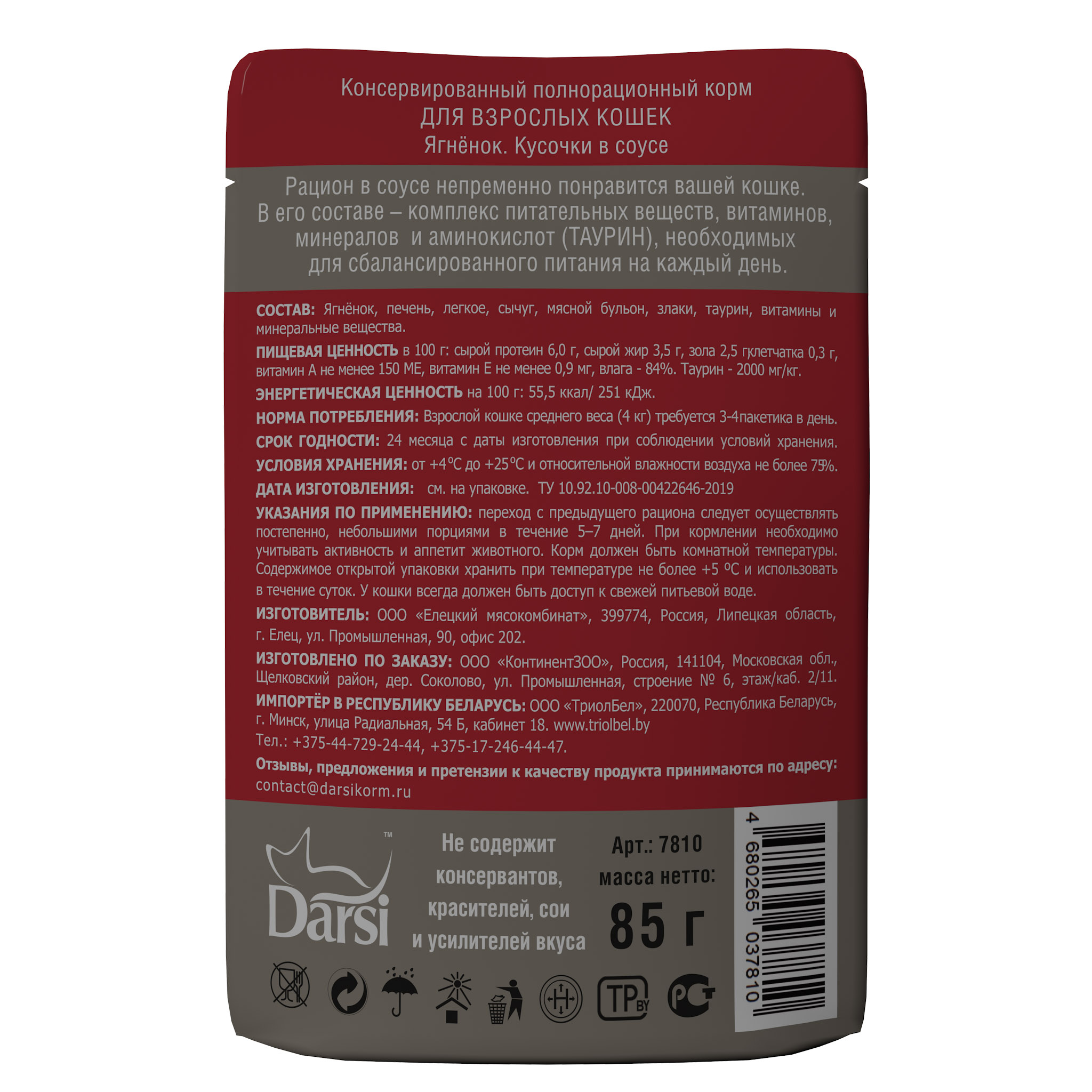 DARSI, Паучи для взрослых кошек, Ягненок, кусочки в соусе, 85 г, 7810