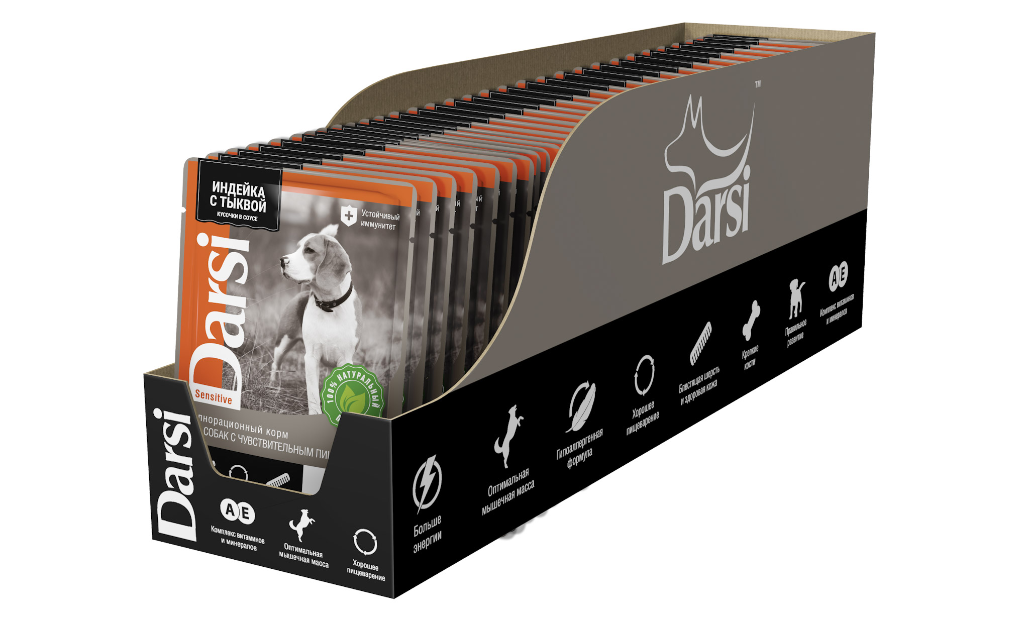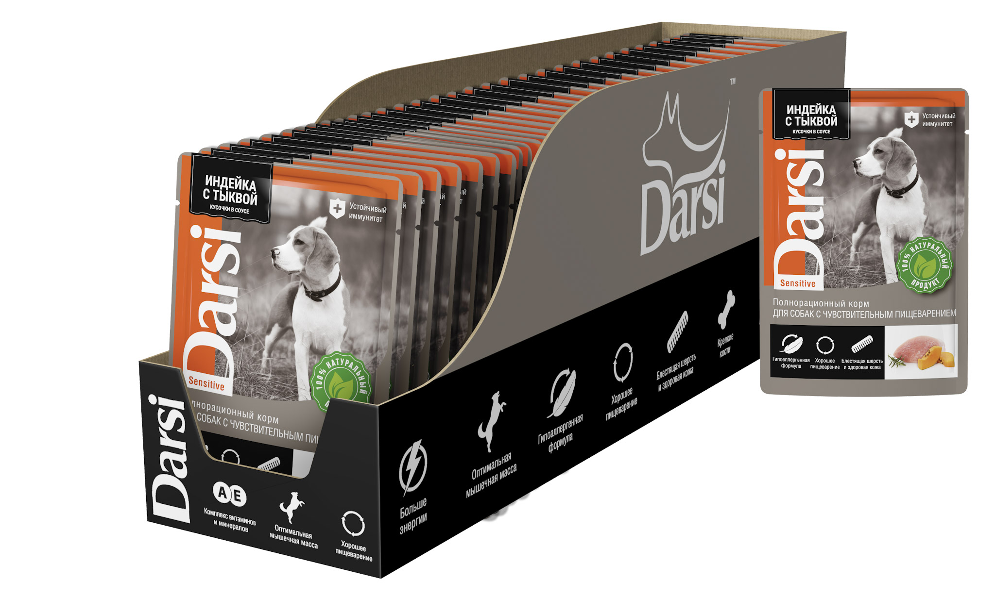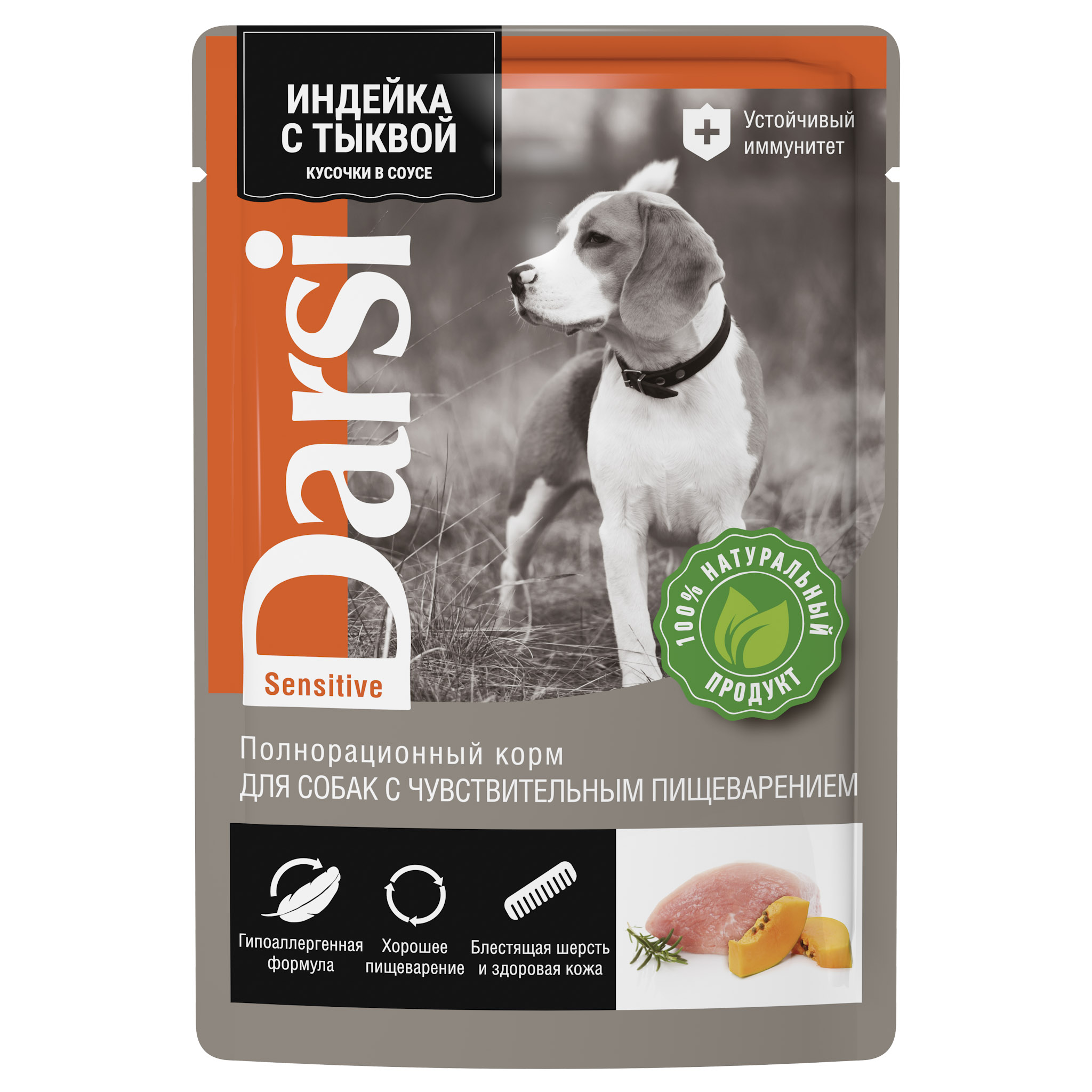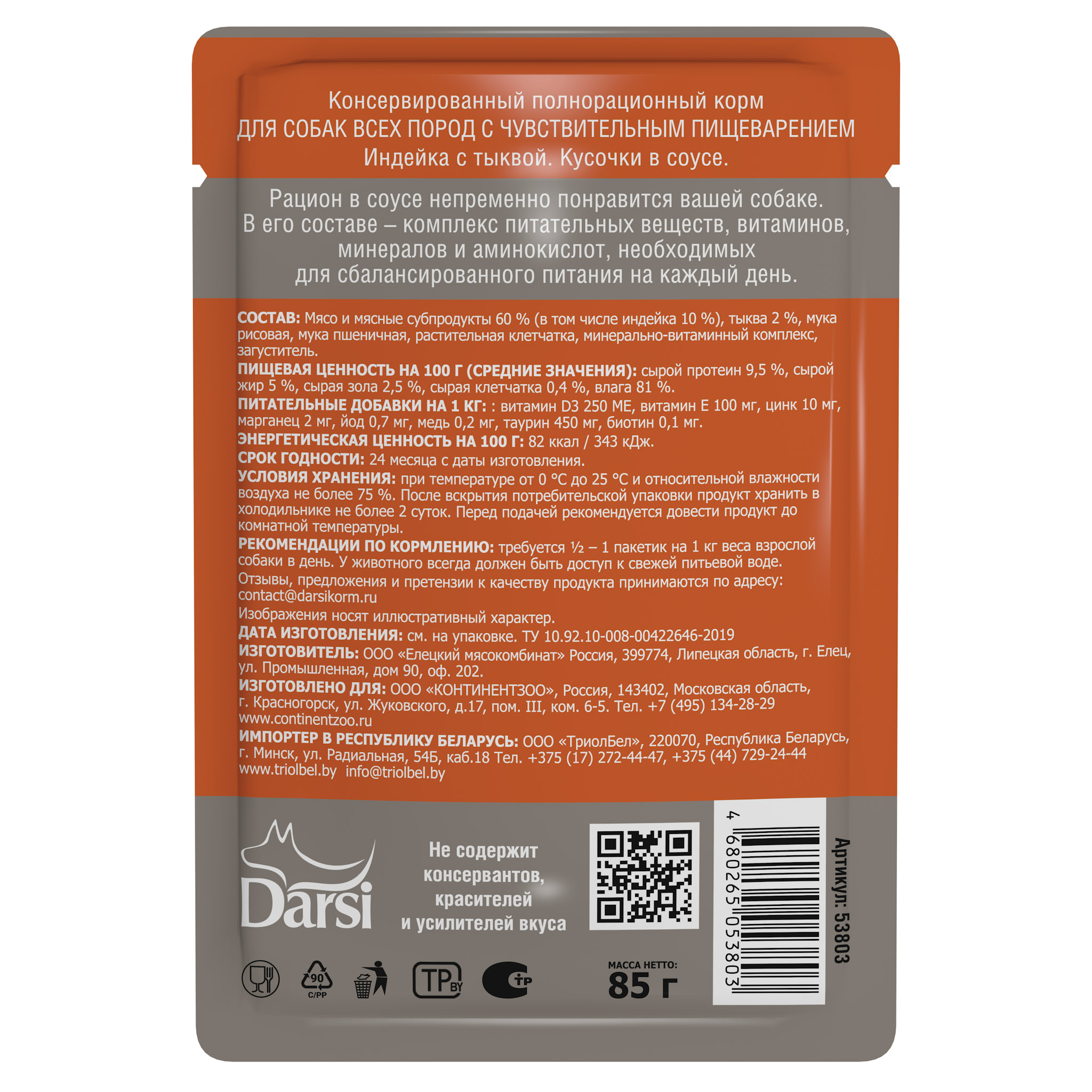 DARSI, Паучи д/собак с чувствительным пищеварением,Индейка с Тыквой, кусочки в соусе,85 г,53803