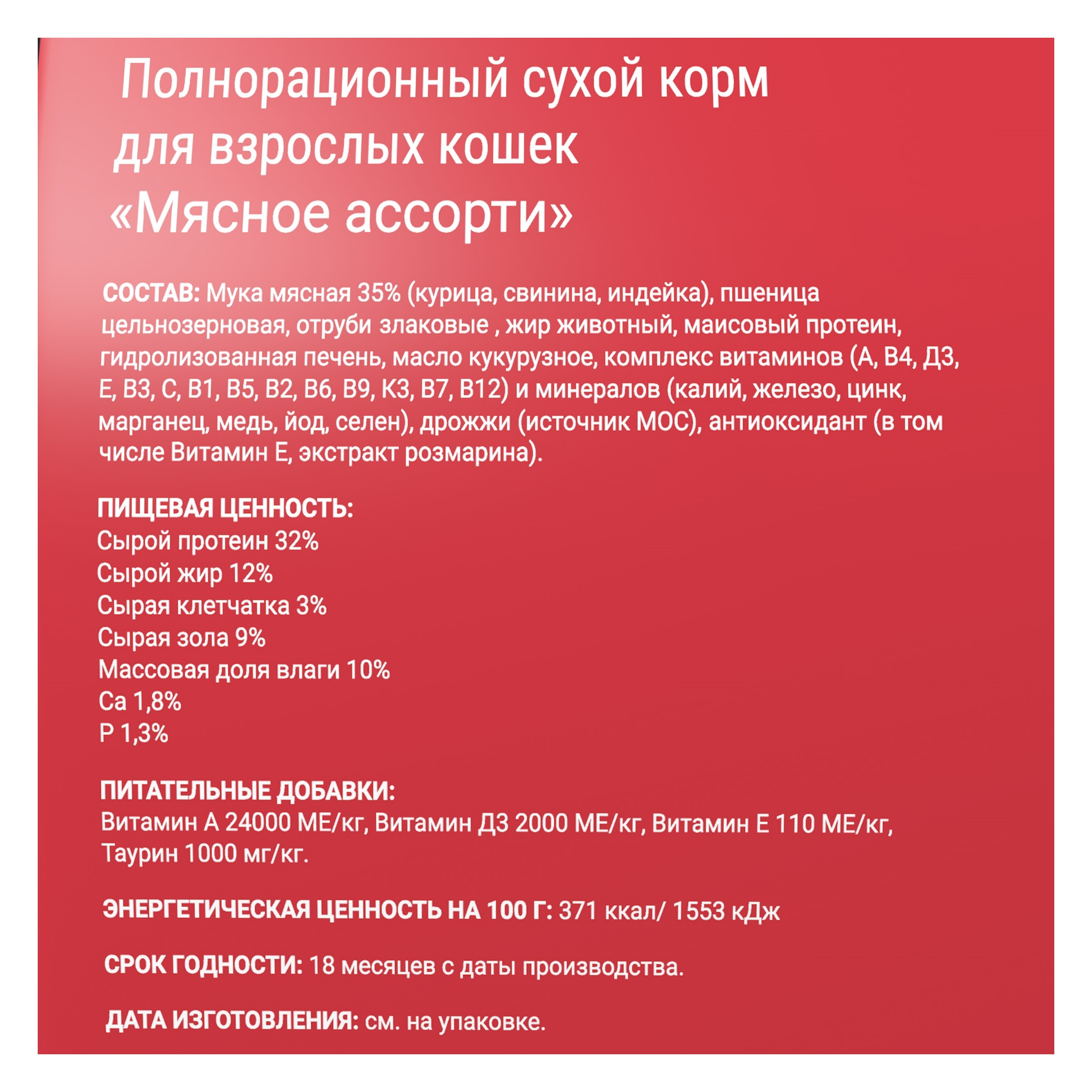 Состав: Мука мясная 35% (курица, свинина, индейка), пшеница цельнозерновая, отруби злаковые, жир животный, маисовый протеин, гидролизованная печень, масло кукурузное, комплекс Витаминов (А, В4, Д3, Е, В3, С, В1, В5, В2, В6, В9, К3, В7, В12) и минералов (калий, Железо (Fe), Цинк (Zn) (Zn), Марганец (Mn), Медь (Cu), Йод (I), Селен (Se) (Se)), дрожжи (источник МОС), антиоксидант (в том числе Витамин Е, экстракт розмарина).