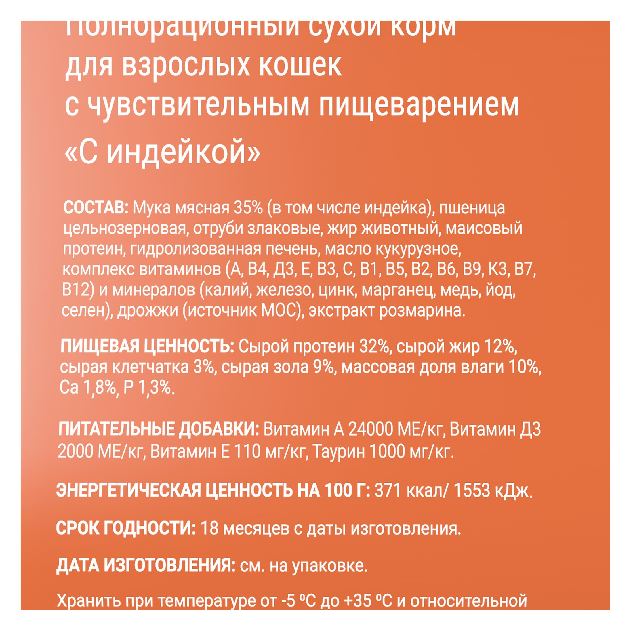 Состав: Мука мясная 35% (в т.ч. индейка), пшеница цельнозерновая, отруби злаковые, жир животный, маисовый протеин, гидролизованная печень, масло кукурузное, комплекс Витаминов (А, В4, Д3, Е, В3, С, В1, В5, В2, В6, В9, К3, В7, В12) и минералов (калий, Железо (Fe), Цинк (Zn) (Zn), Марганец (Mn), Медь (Cu), Йод (I), Селен (Se) (Se)), дрожжи (источник МОС), антиоксидант (в том числе Витамин Е, экстракт розмарина).