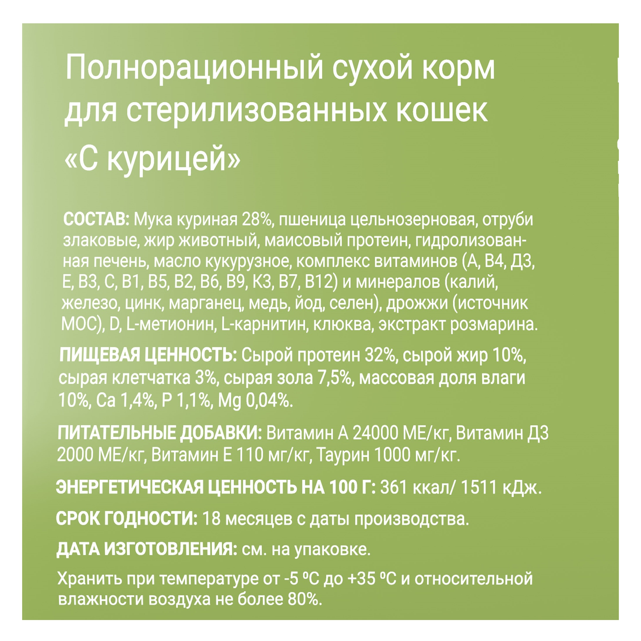 Состав: Мука куриная 28%, пшеница цельнозерновая, отруби злаковые, жир животный, маисовый протеин, гидролизованная печень, масло кукурузное, комплекс Витаминов (А, В4, Д3, Е, В3, С, В1, В5, В2, В6, В9, К3, В7, В12) и минералов (калий, Железо (Fe), Цинк (Zn) (Zn), Марганец (Mn), Медь (Cu), Йод (I), Селен (Se) (Se)), дрожжи (источник МОС), D, L-метионин, L-карнитин, клюква, антиоксидант (в том числе Витамин Е, экстракт розмарина).