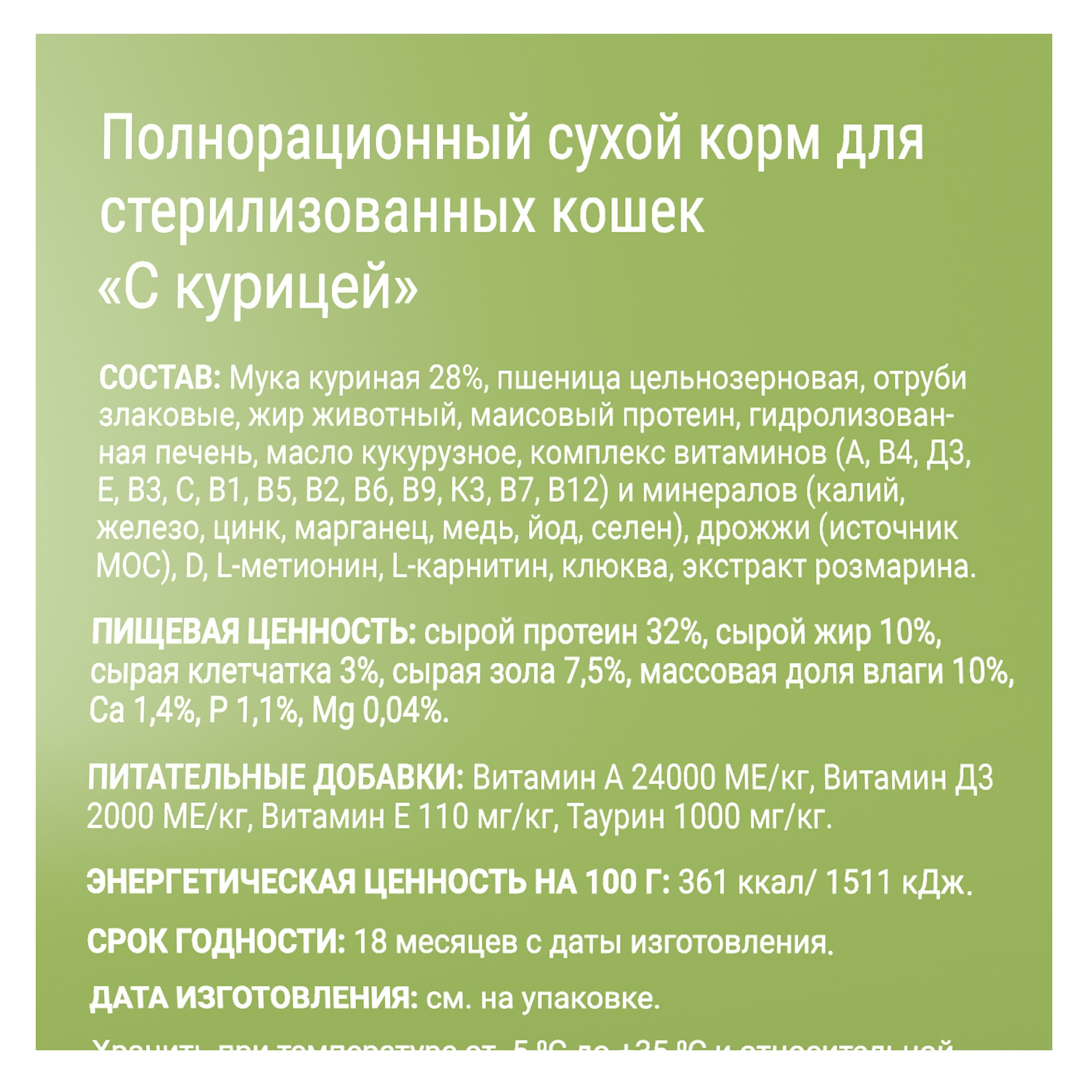 Состав: Мука куриная 28%, пшеница цельнозерновая, отруби злаковые, жир животный, маисовый протеин, гидролизованная печень, масло кукурузное, комплекс Витаминов (А, В4, Д3, Е, В3, С, В1, В5, В2, В6, В9, К3, В7, В12) и минералов (калий, Железо (Fe), Цинк (Zn) (Zn), Марганец (Mn), Медь (Cu), Йод (I), Селен (Se) (Se)), дрожжи (источник МОС), D, L-метионин, L-карнитин, клюква, антиоксидант (в том числе Витамин Е, экстракт розмарина).